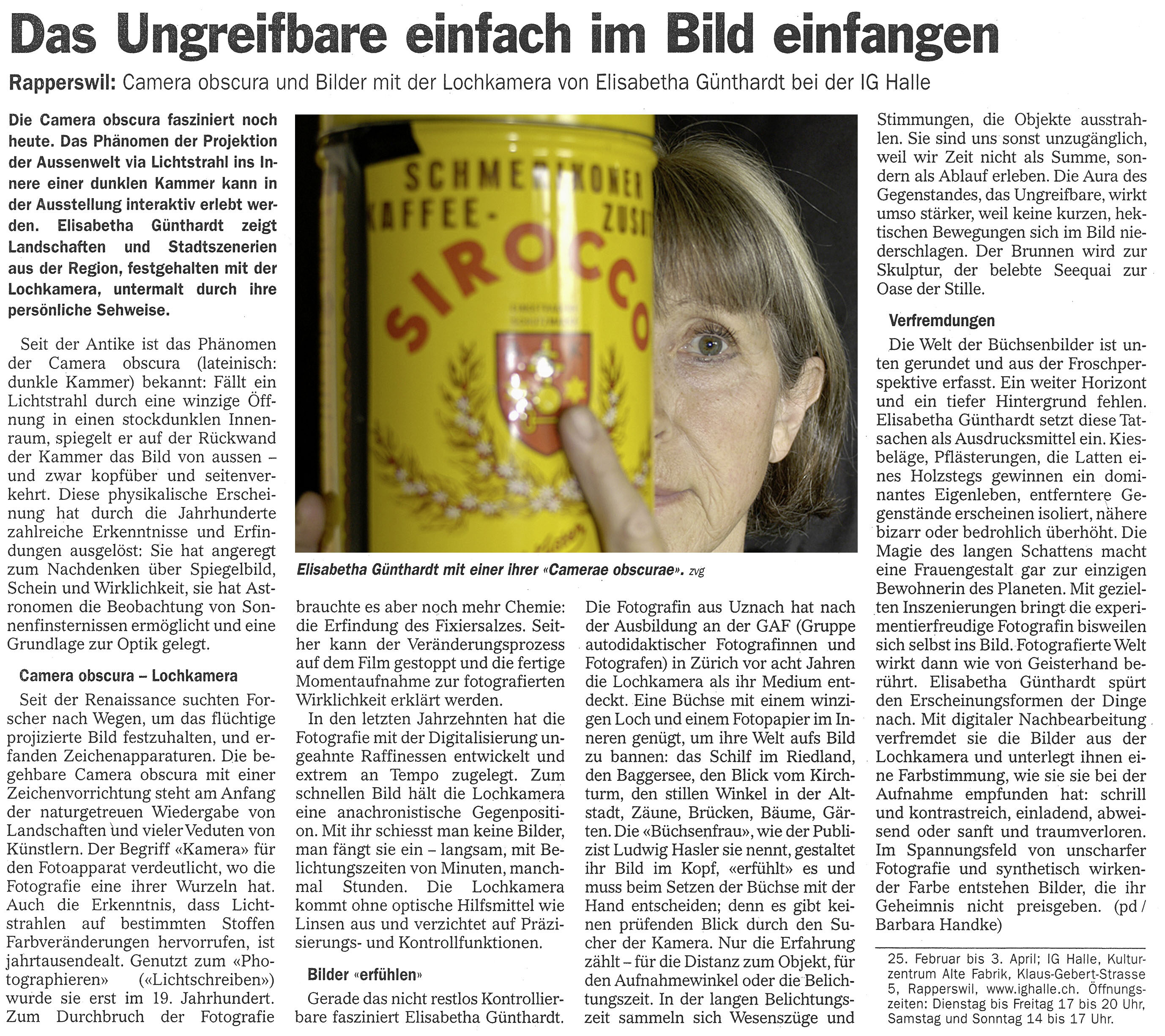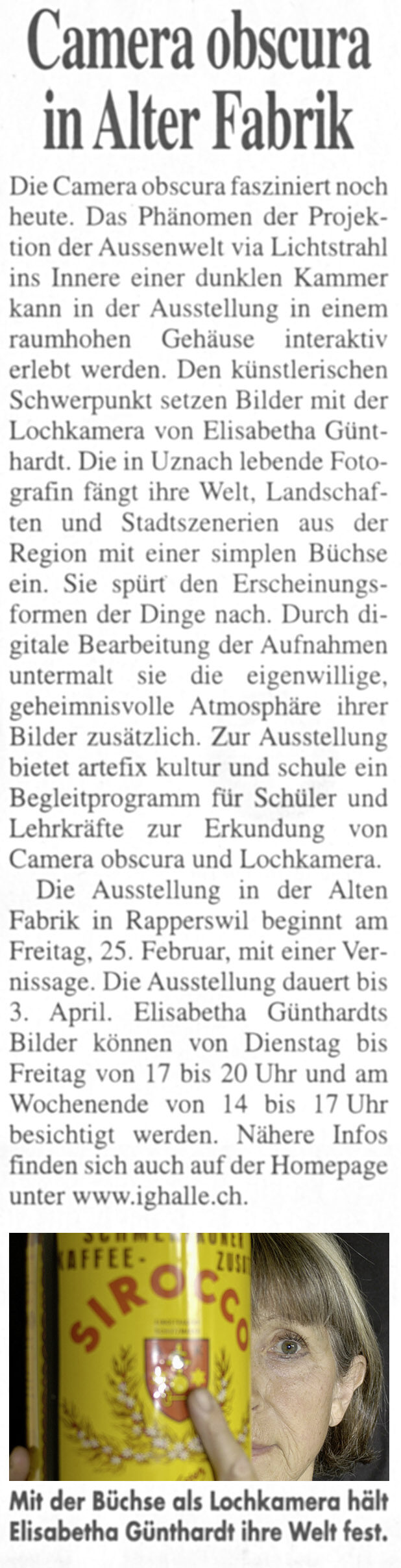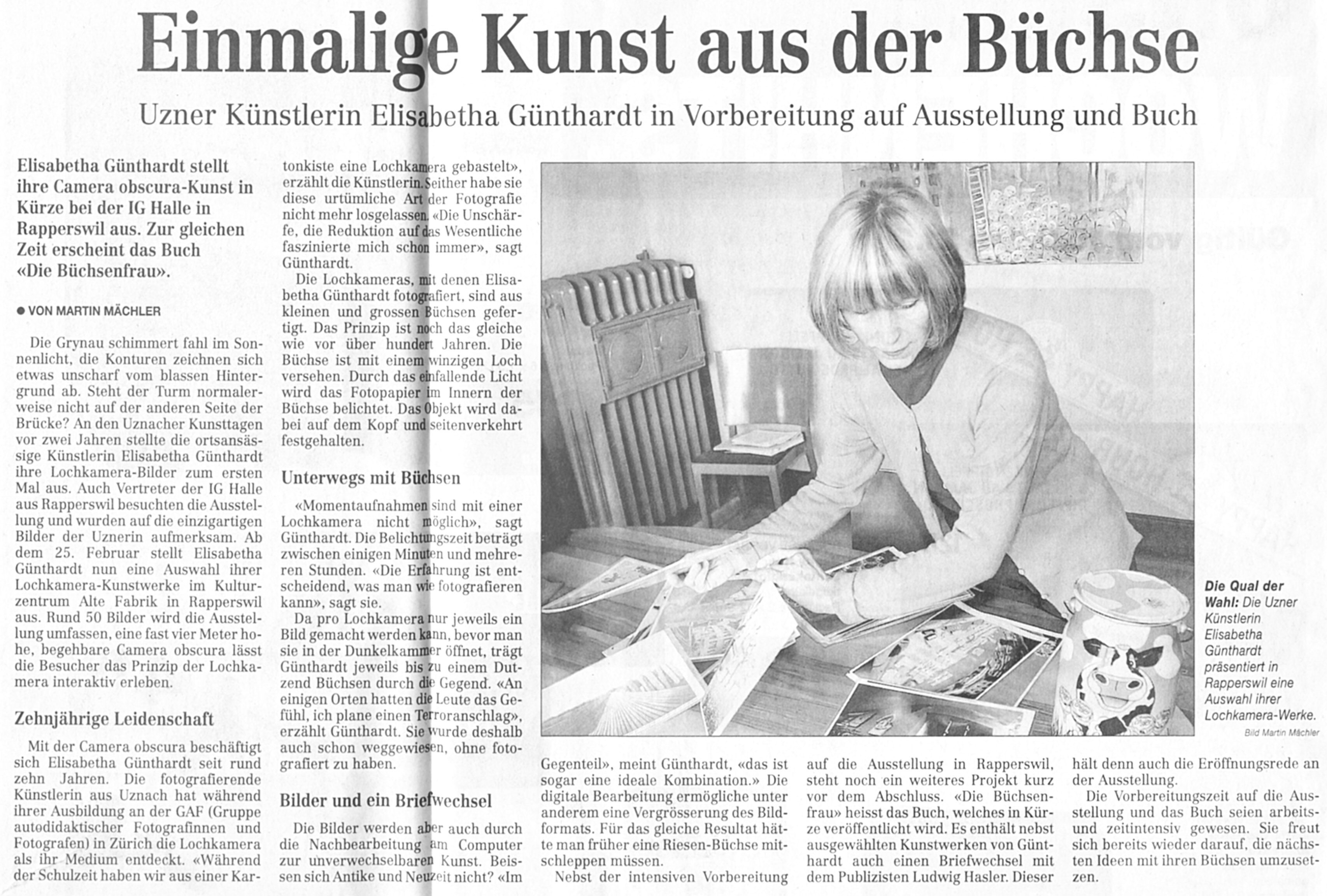 Gerade das nicht restlos Kontrollierbare fasziniert Elisabetha Günthardt. Die Fotografin aus Uznach hat nach der Ausbildung an der GAF (Gruppe autodidaktischer Fotografinnen und Fotografen) in Zürich vor acht Jahren die Lochkamera als ihr Medium entdeckt. Eine Büchse mit einem winzigen Loch und einem