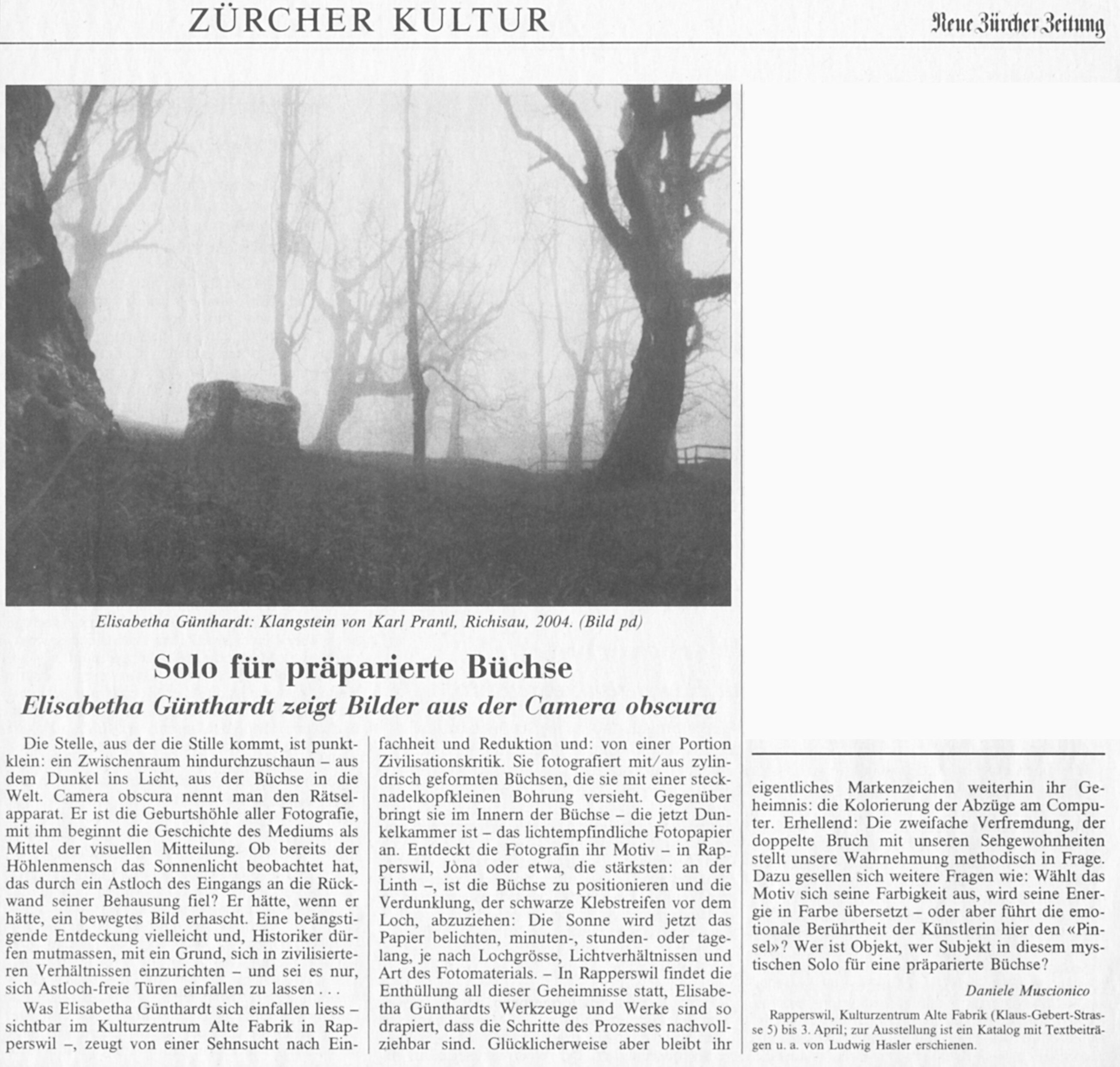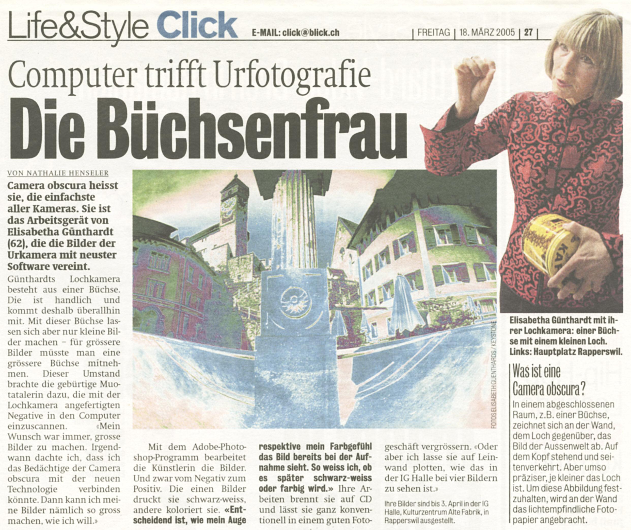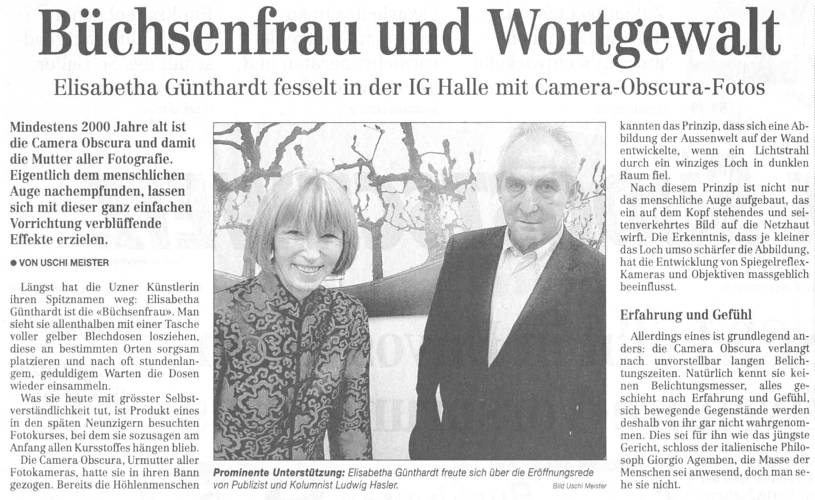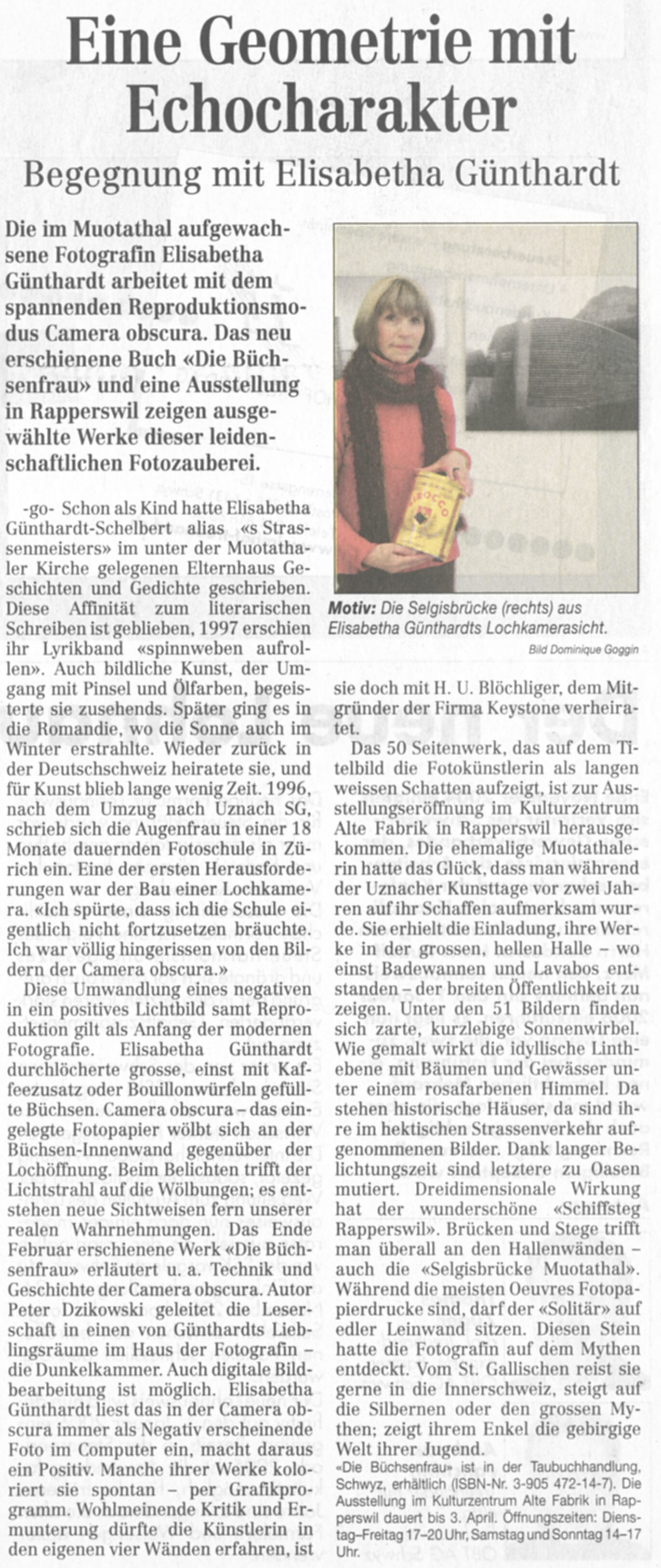 Gerade das nicht restlos Kontrollierbare fasziniert Elisabetha Günthardt. Die Fotografin aus Uznach hat nach der Ausbildung an der GAF (Gruppe autodidaktischer Fotografinnen und Fotografen) in Zürich vor acht Jahren die Lochkamera als ihr Medium entdeckt. Eine Büchse mit einem winzigen Loch und einem