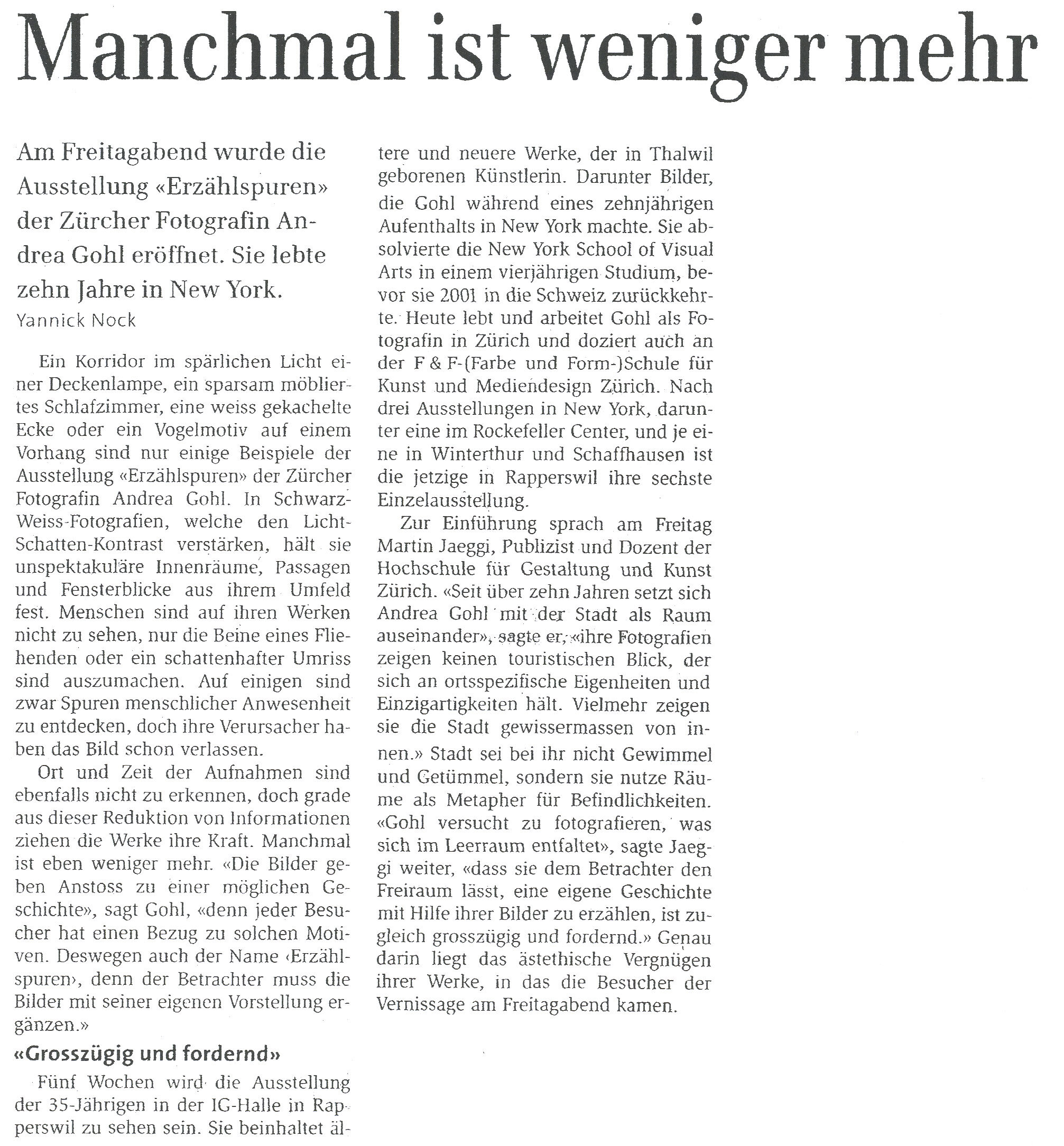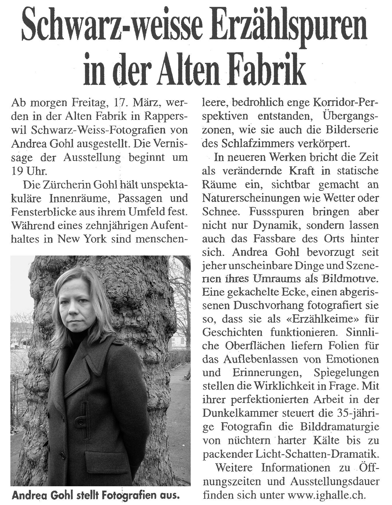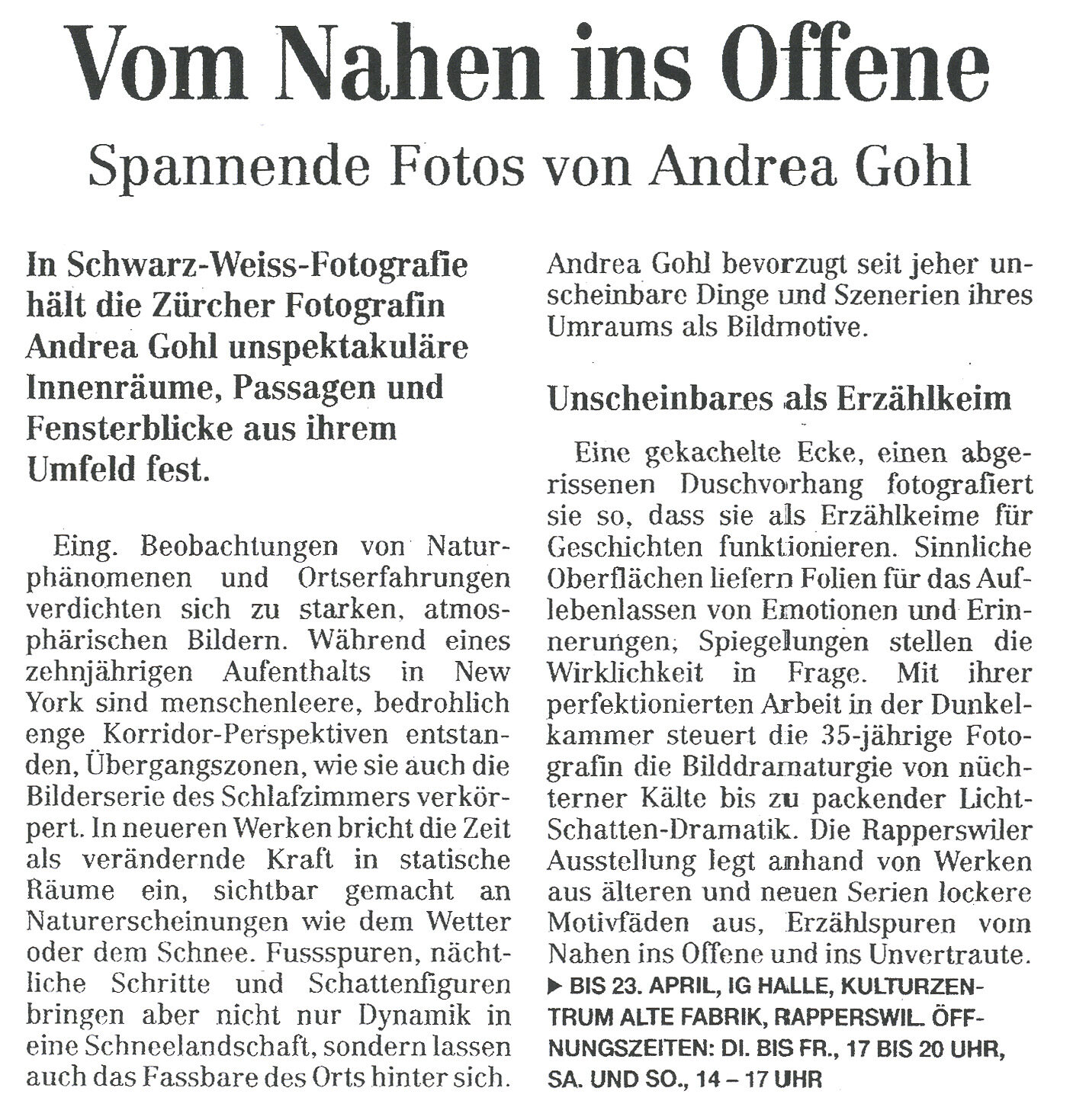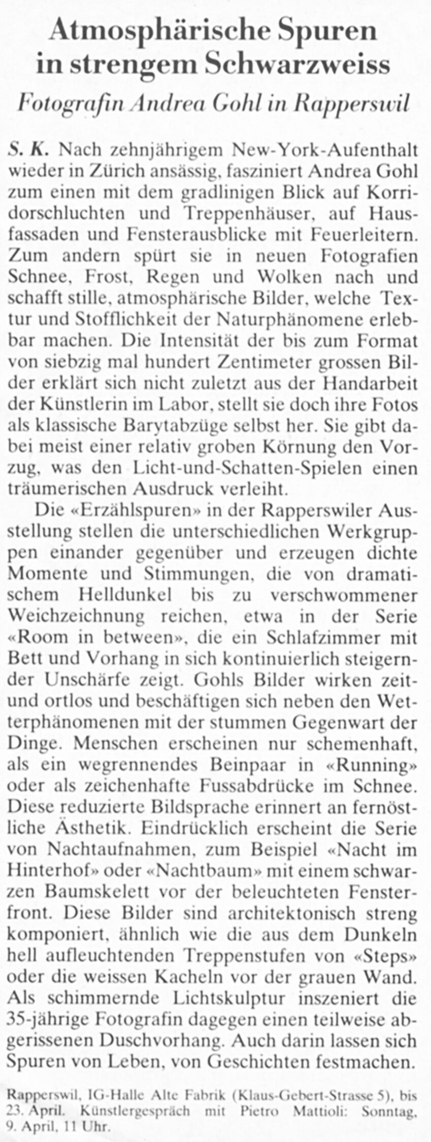 Die Schwarz-Weiss-Fotografie von Andrea Gohl kommt ganz ohne digitale Bearbeitung aus. Viel von ihrer Intensität verdankt sie der Arbeit in der Dunkelkammer, wo die Künstlerin Baryt-Abzüge bis zu Grossformaten von 70 × 100 Zentimetern herstellt und die Bilddramaturgie perfekt steuert: nüchtern harte Kälte, verschwommene Weichzeichnung, zwiespältiges Hell-Dunkel, packende Licht-Schatten-Dramatik. Die Rapperswiler Ausstellung mit Werken aus verschiedenen Serien entwickelt dichte Stimmungsmomente und legt in der Gegenüberstellung von Bildern lockere Motivfäden aus, Erzählspuren vom Nahen ins Offene und ins Unvertraute.