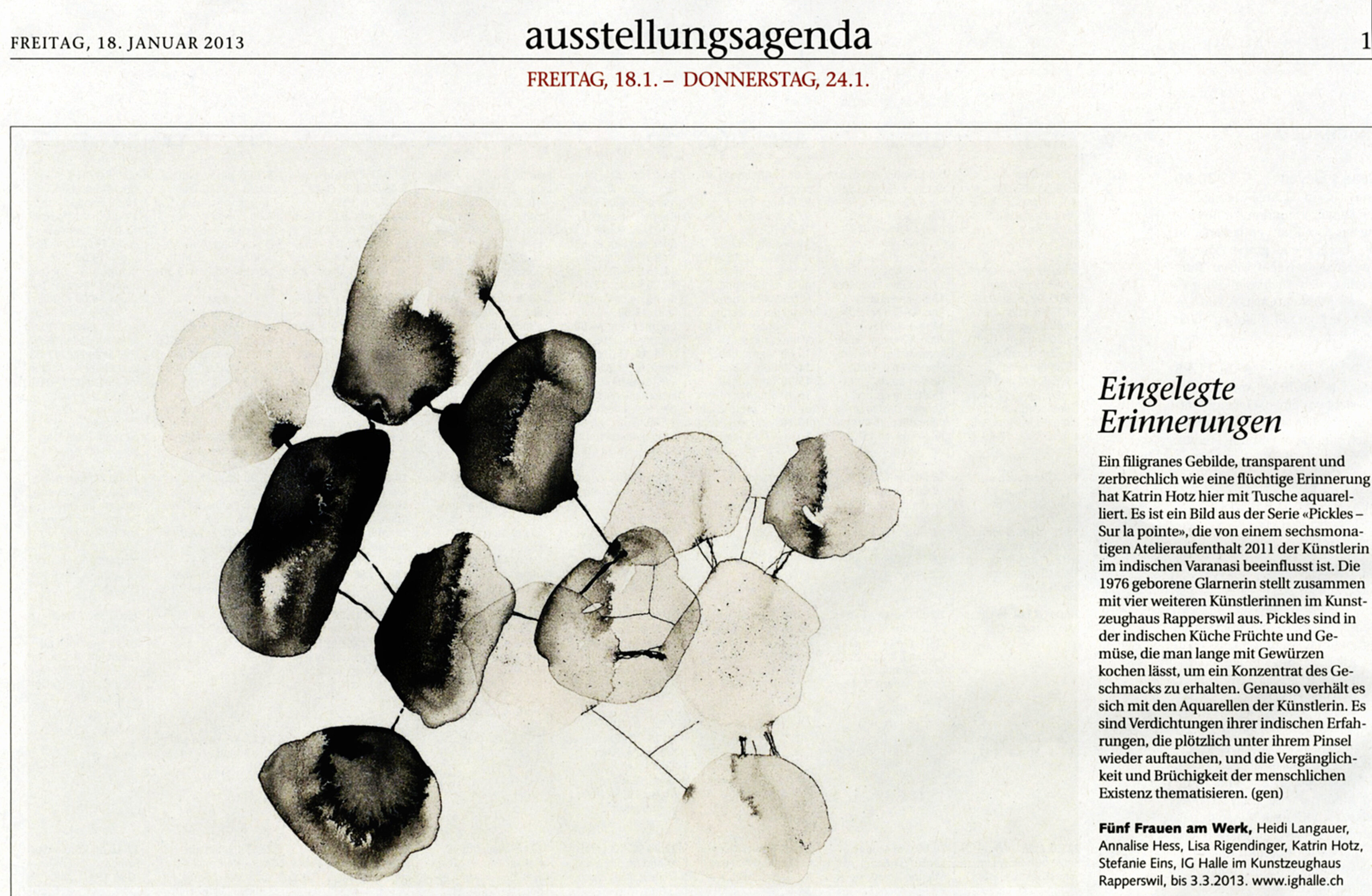 Die neuesten Arbeiten von Katrin Hotz, darunter auch grossformatige, gehören zur Serie «Pickles – Sur la pointe». Die Pickles, ein in einem Reifungsprozess gebildetes Konzentrat, sind hier Verdichtungen, vertiefte Bearbeitungen, die unter anderem von der Erfahrung eines sechsmonatigen Atelier-Aufenthalts in Varanasi, Indien im Jahr 2011 beeinflusst sind. Sie enthalten Bilder, die sich auch heute noch niederschlagen in Aquarell und Tusche, und trotz der bunten Eindrücke in Schwarz Weiss. Seit Jahren formt und bearbeitet Katrin Hotz ihre Inhalte mit den Mitteln des Hell-Dunkel, den feinen Abstufungen von Grau und deren Wirkung je nach Materialität des Papiers. Die Aquarell-Technik entspricht dem Flüchtigen, dem Thema von Vergänglichkeit und Zerfall, aber auch der Leichtigkeit, die viele ihrer Arbeiten ausstrahlen.