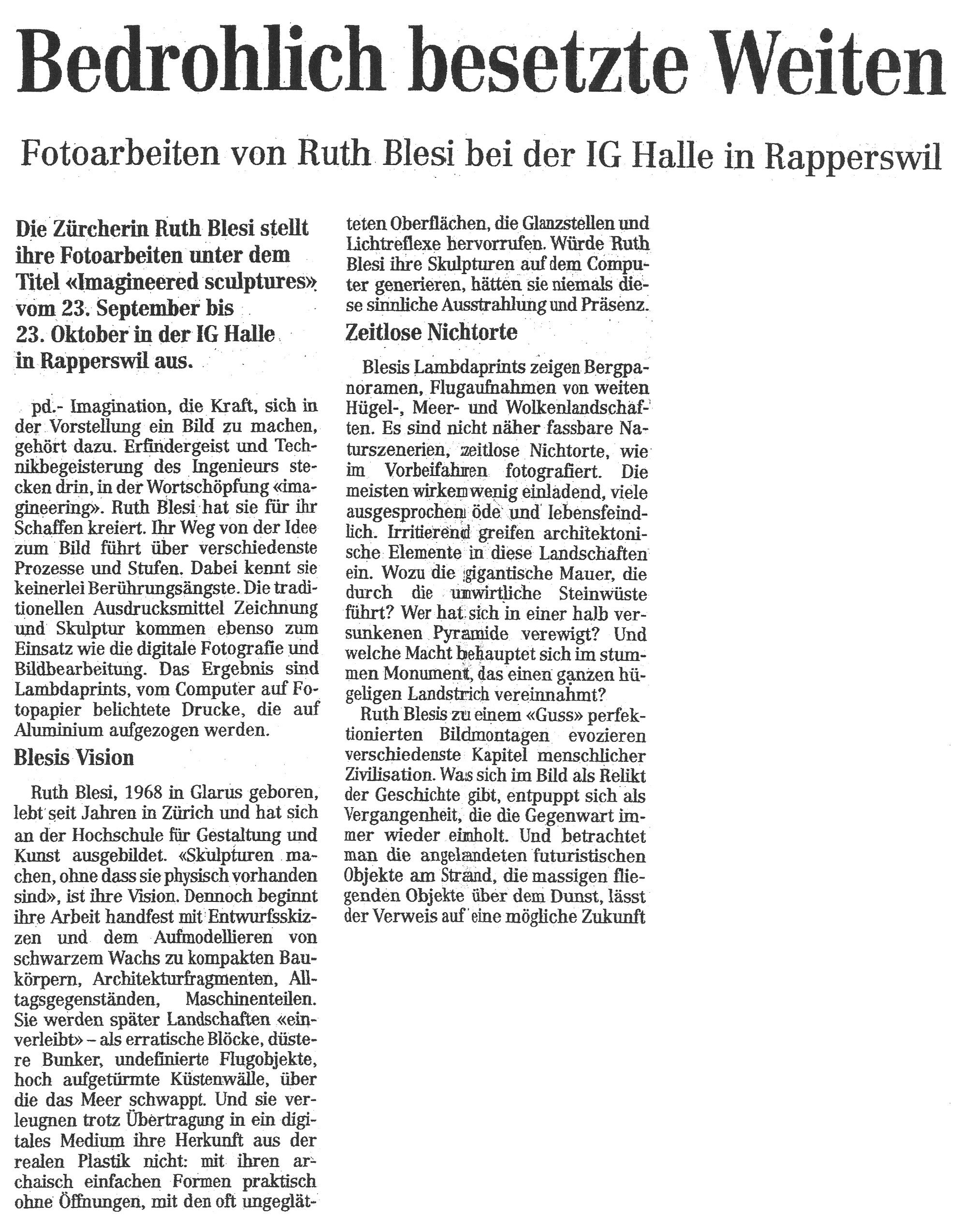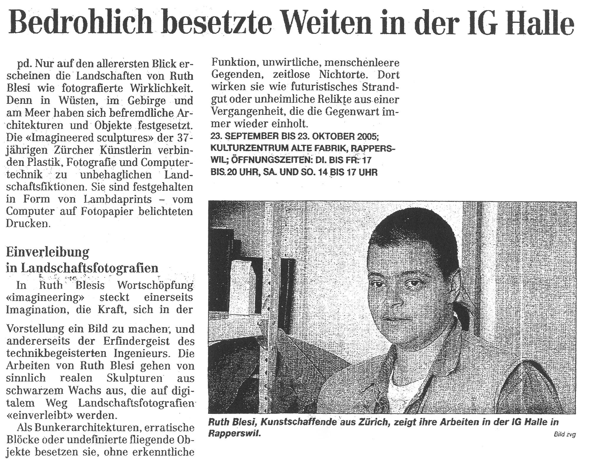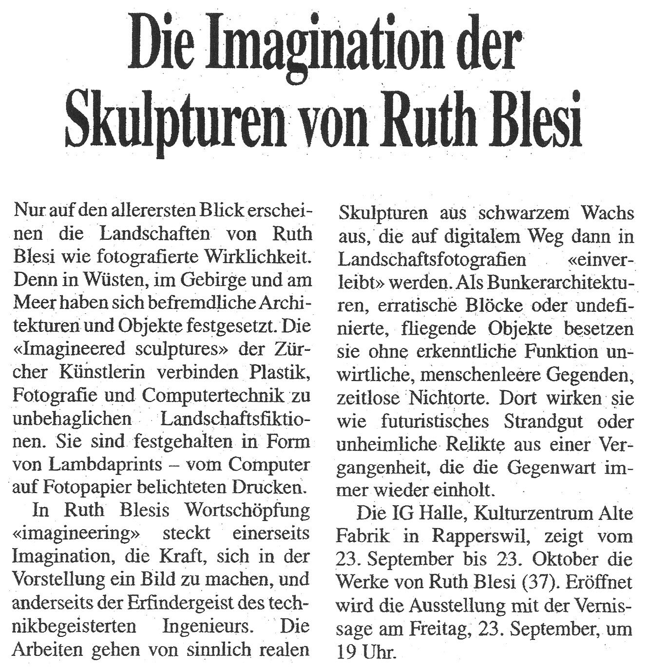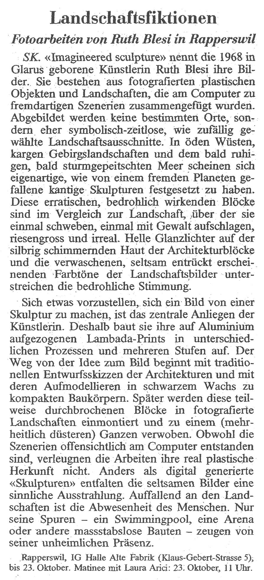Ruth Blesi, 1968 in Glarus geboren, lebt seit Jahren in Zürich und hat sich an der Hochschule für Gestaltung und Kunst ausgebildet. „Skulpturen machen, ohne dass sie physisch vorhanden sind“, ist ihre Vision. Dennoch beginnt ihre Arbeit handfest mit Entwurfsskizzen und dem Aufmodellieren von schwarzem Wachs zu kompakten Baukörpern, Architekturfragmenten, Alltagsgegenständen, Maschinenteilen. Sie werden später Landschaften „einverleibt“ – als erratische Blöcke, düstere Bunker, undefinierte Flugobjekte, hoch aufgetürmte Küstenwälle, über die das Meer schwappt. Und sie verleugnen trotz Übertragung in ein digitales Medium ihre Herkunft aus der realen Plastik nicht: mit ihren archaisch einfachen Formen praktisch ohne Öffnungen, mit den oft ungeglätteten Oberflächen, die Glanzstellen und Lichtreflexe hervorrufen. Würde Ruth Blesi ihre Skulpturen auf dem Computer generieren, hätten sie niemals diese sinnliche Ausstrahlung und Präsenz.