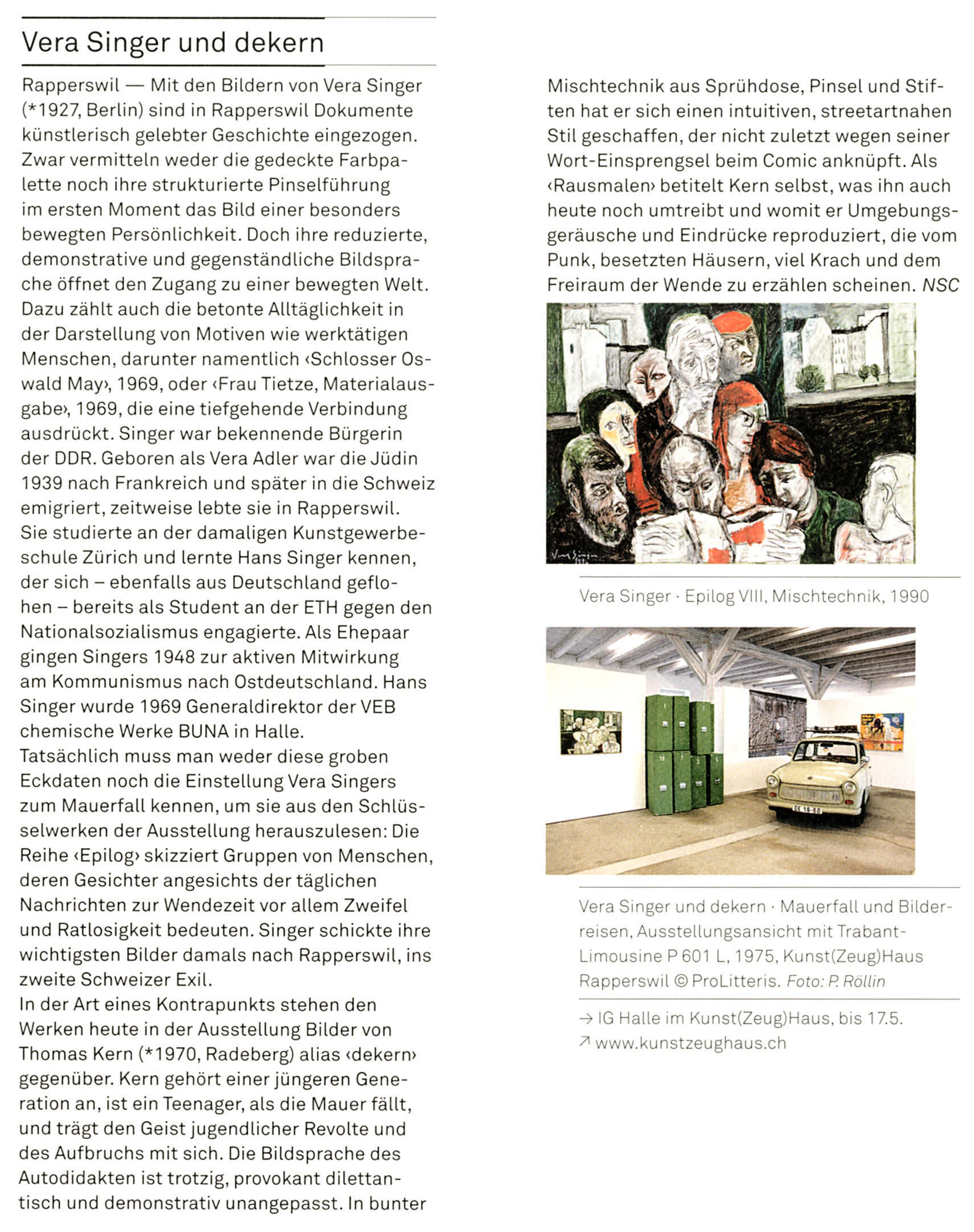 Exilland Schweiz zweimal für die heute 88-jährige Berlinerin Vera Singer: 1944 als jüdisches Kind und nach dem Mauerfall 1989 für ihre Bilder auf dem Weg nach Rapperswil. Der Verein IG Halle erzählt in der Ausstellung im Kunst(Zeug)Haus die ungewöhnliche Geschichte, ergänzt mit Werken des 1970 in der DDR geborenen Malers dekern.