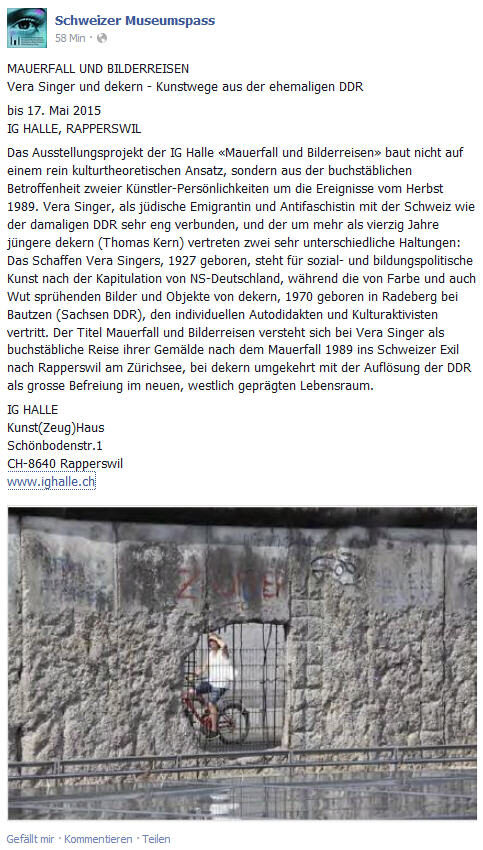 Geopolitisch war der Berliner Mauerfall am 9. November 1989 eines der wichtigsten Ereignisse seit dem Ende des Zweiten Weltkrieges. Mit dem Fall der Mauer verband sich die Auf-lösung der 1949 gegründeten Deutschen Demokratischen Republik DDR. Mit dem Auseinanderbrechen der Sowjetunion hat sich die Welt in neue Verhältnisse begeben. Der folgen-schwere Systemwechsel und die Wiedervereinigung in den beiden Teile Deutschlands bewegten auch ganz unterschiedlich Künstlerinnen und Künstler. Vera Singer, 1927 in Berlin geboren, hat in den Jahren nach Ende des Zweiten Weltkriegs sich im Sowjetsektor am Wiederaufbau auf ihre Weise als Künstlerin stark engagiert. Für sie erschütterte der Mauerfall Grundfesten im bisherigen Leben: „Plötzlich, mit dem Ende der DDR, war für mich die Identität verloren. Wusste ich etwas mit dem Gedanken anzufangen, als ich erfuhr, dass ich meine Jahre im Irrtum verbracht haben sollte?“ DDR als Heimat war wie weggefegt. Die Künstlerin schickte ihre Bilder nach den Novembertagen 1989 in die Emigration an den Zü-richsee. Mauerfall und Bilderreisen – eine wahre Geschichte mit tiefer Betroffenheit, aber auch heiterem Ende. Für den mehr als 40 Jahren jüngeren Künstler dekern, mit bürgerli-chem Namen Thomas Kern 1970 in Radeberg bei Dresden geboren, bedeutete der Mauerfall die entscheidende Befreiung.