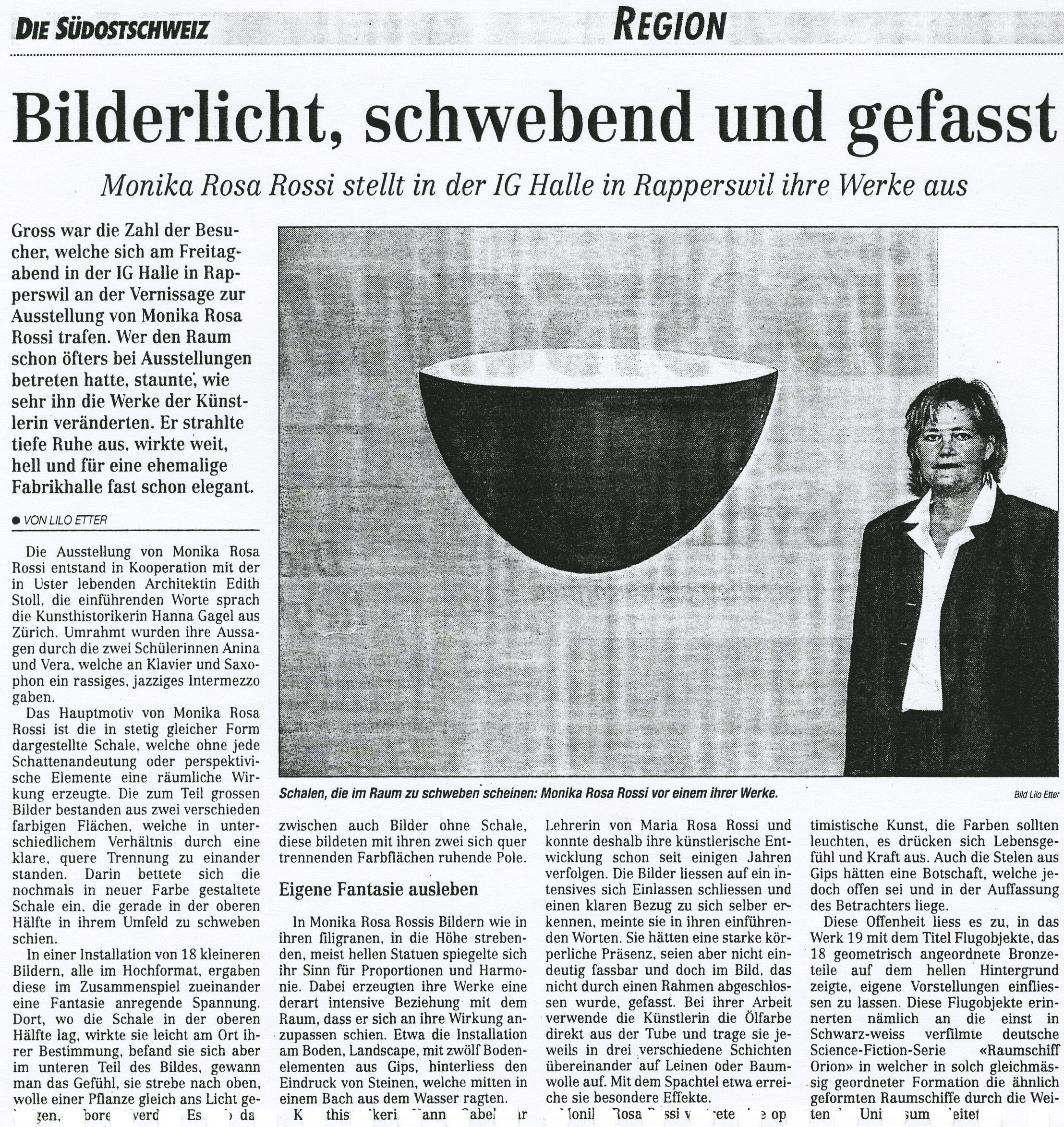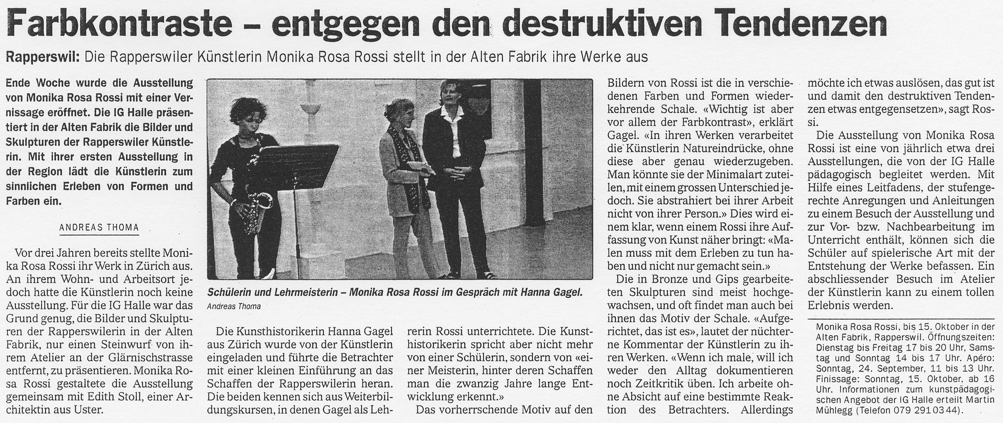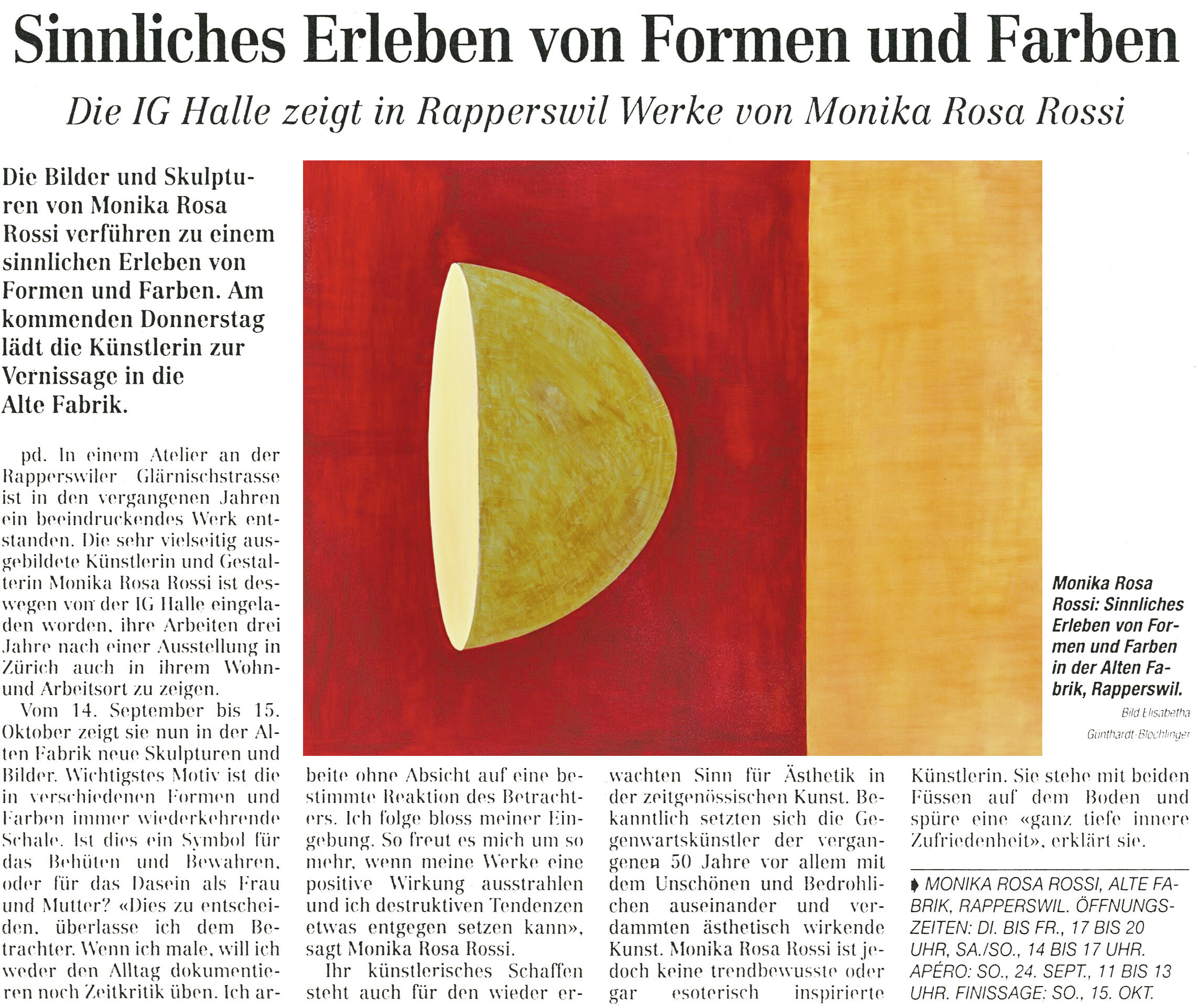 Vom 14. September bis 15. Oktober zeigt sie nun in der Alten Fabrik neue Skulpturen und Bilder. Wichtigstes Motiv ist die in verschiedenen Formen und Farben immer wieder kehrende Schale. Ist dies ein Symbol für das Behüten und Bewahren, oder für das Dasein als Frau und Mutter? „Dies zu entscheiden, überlasse ich dem Betrachter. Wenn ich male, will ich weder den Alltag dokumentieren noch Zeitkritik üben. Ich arbeite ohne Absicht auf eine bestimmte Reaktion des Betrachters. Ich folge bloss meiner Eingebung. So freut es mich umso mehr, wenn meine Werke eine positive Wirkung ausstrahlen und ich destruktiven Tendenzen etwas entgegen setzen kann“, sagt Monika Rosa Rossi.