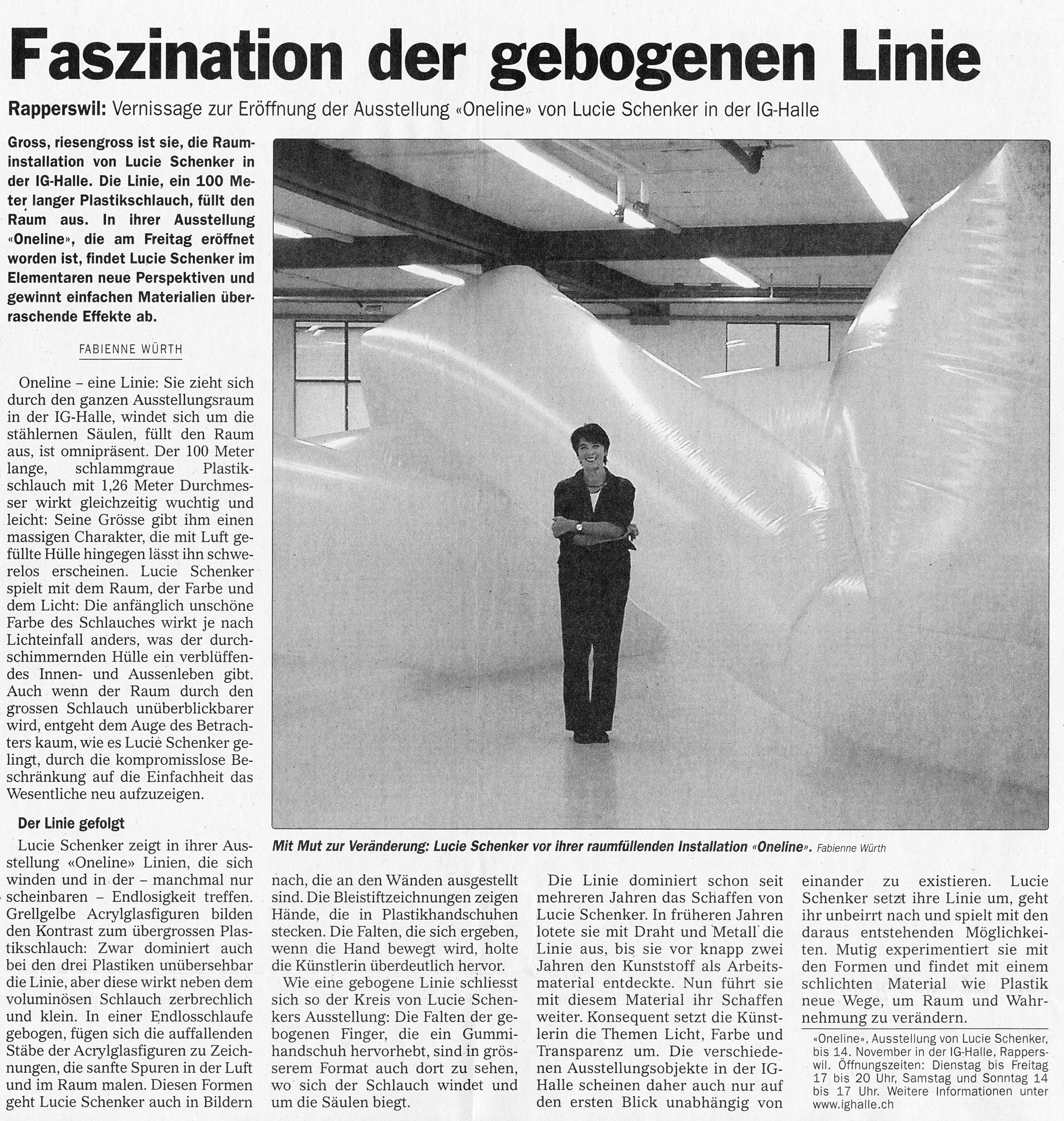 Seit gut zwei Jahren arbeitet Lucie Schenker jetzt mit Kunststoff – weiches synthetisches Material, statt widerspenstiges, der Natur abgerungenes Metall. Bei aller Unterschiedlichkeit der Voraussetzungen: Die Rapperswiler Installation „Oneline“ und die anderen gezeigten Objekte und Zeichnungen führen die Gedankenwelt der Künstlerin weiter.