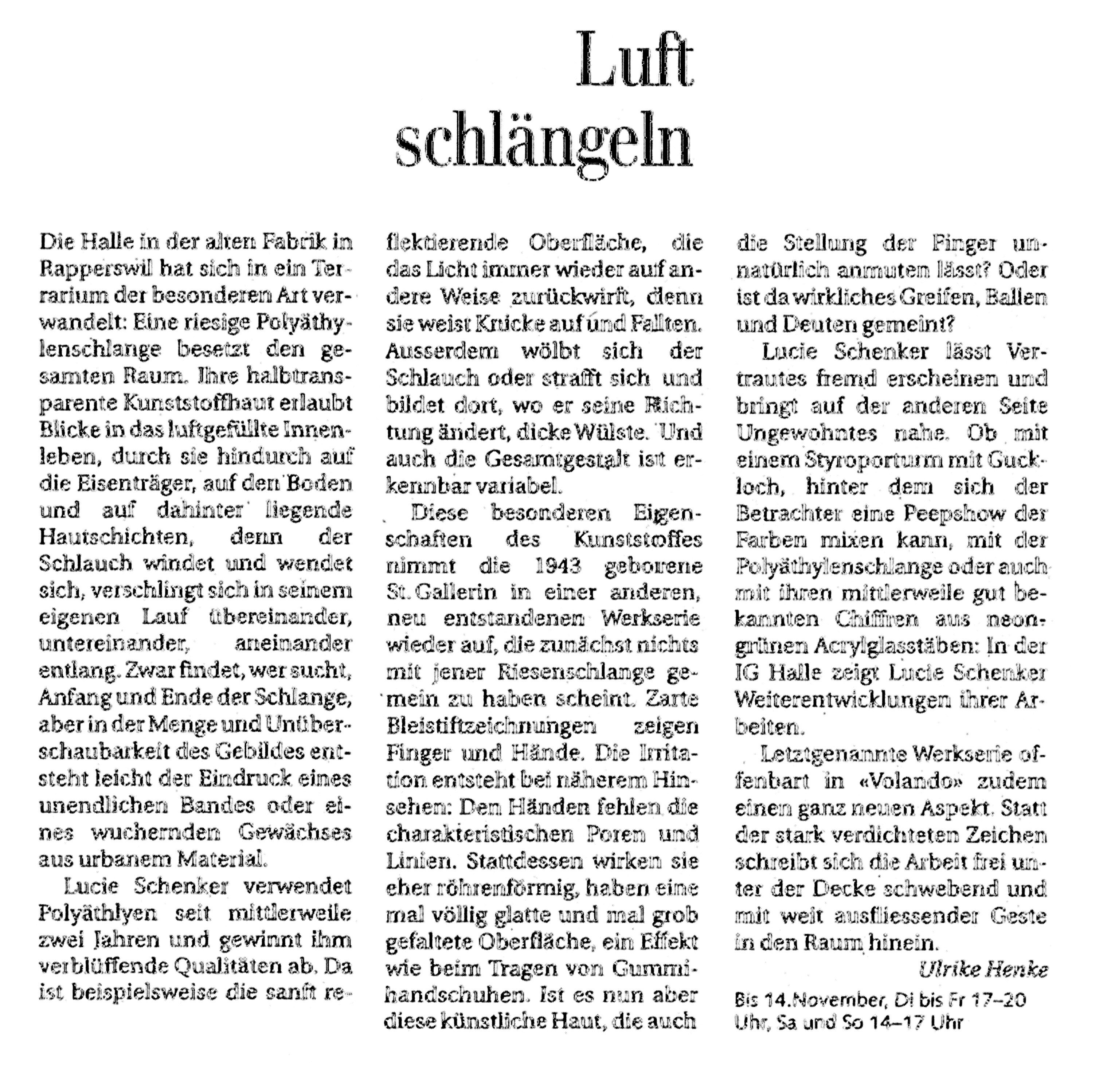 Bei Lucie Schenker wird ein luftgefüllter Kunststoffschlauch zur voluminösen Rauminstallation. Die experimentierfreudige St.Galler Künstlerin gewinnt schlichten Materialien unerwartete Effekte ab. Licht, Transparenz und Leichtigkeit prägen auch ihre jüngsten Plastiken.
