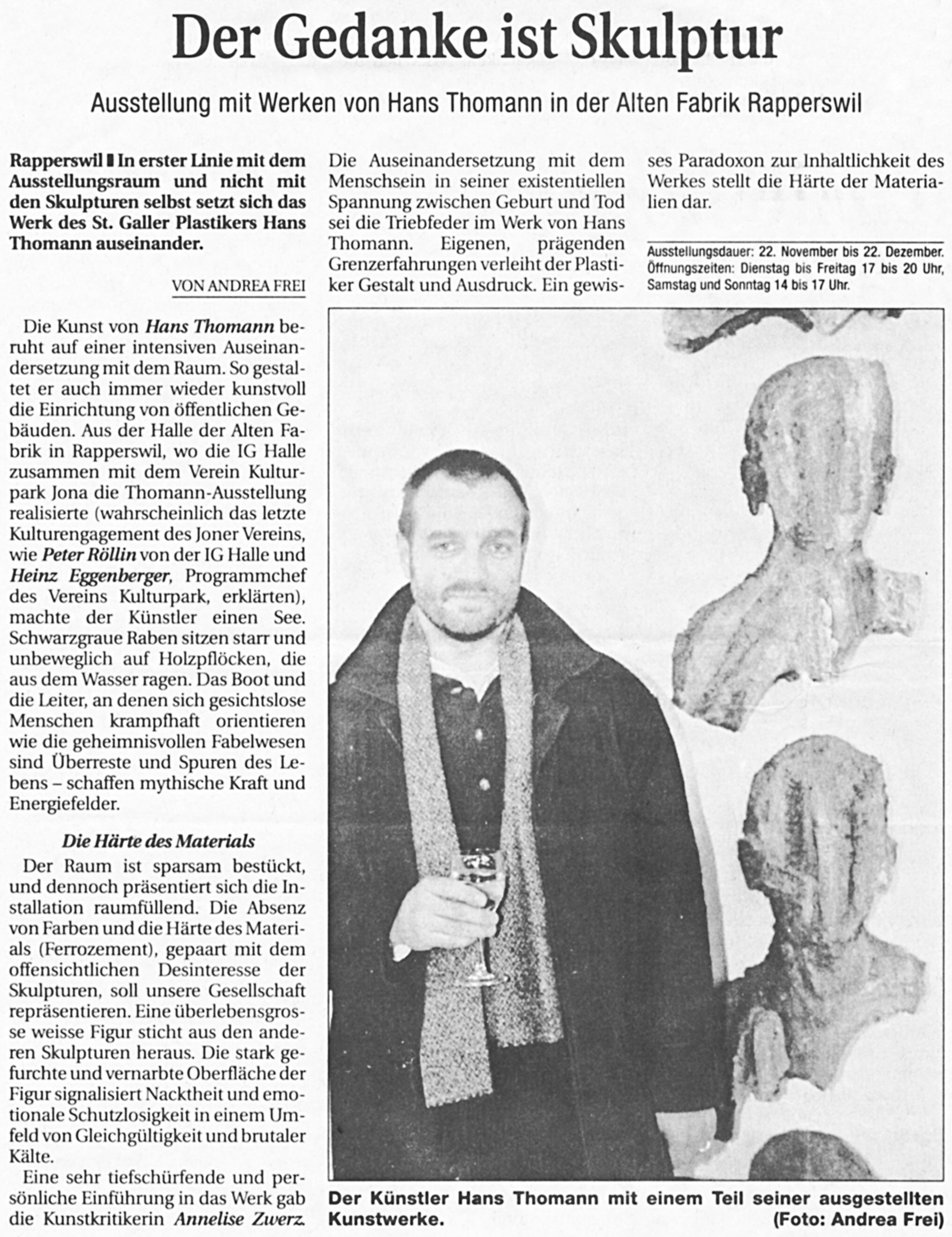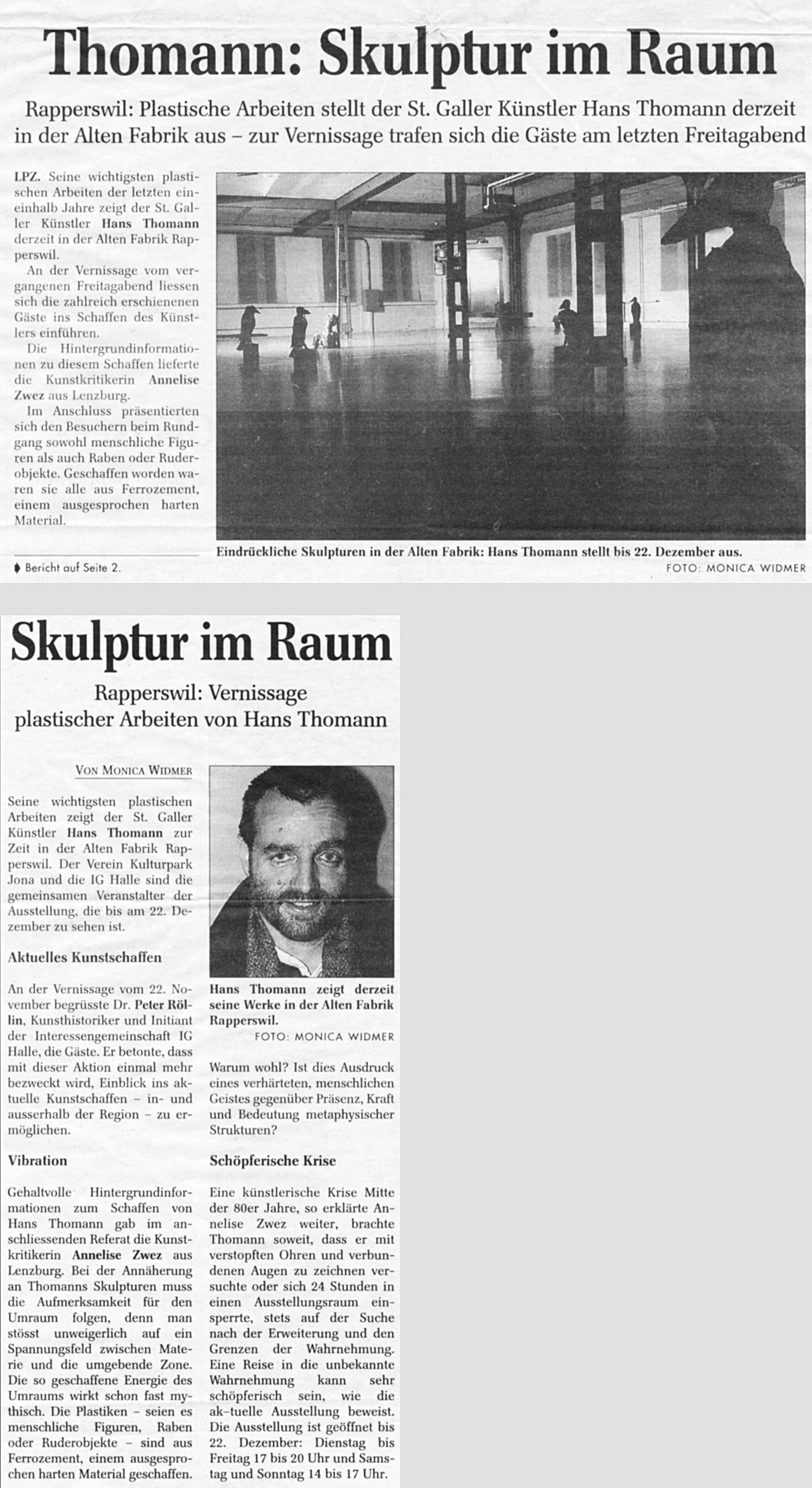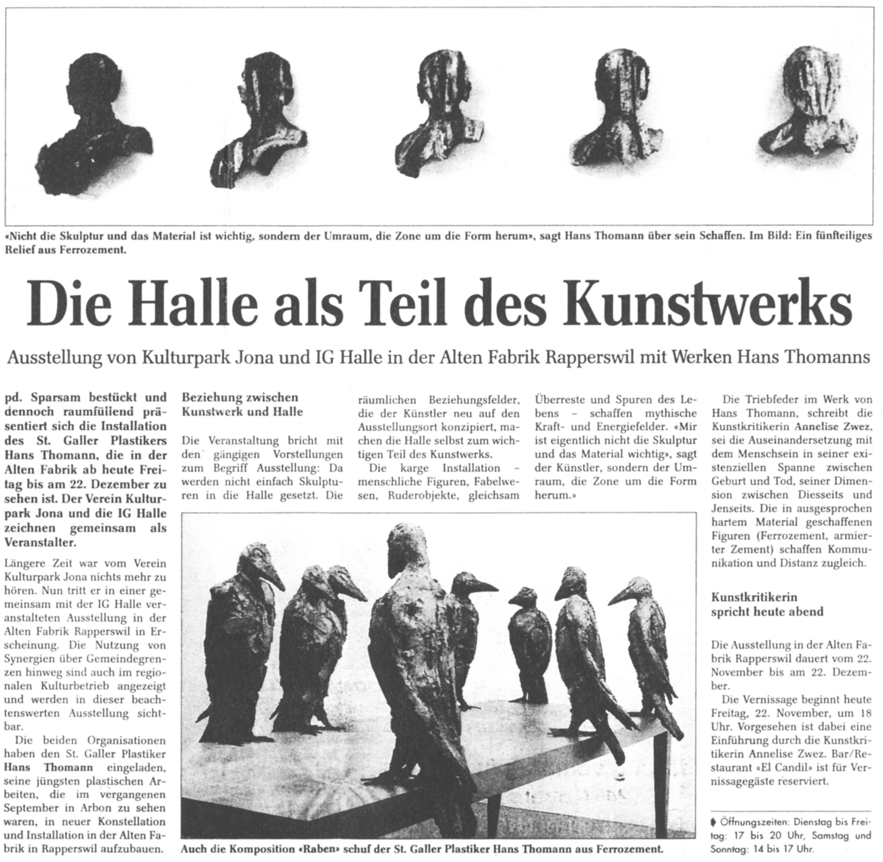 Wer oder was zeigt schon im Aussen, was er, sie oder es im lnnern ist. „Der Gedanke ist Skulptur“, sagte Joseph Beuys. Man könnte, gerade hier am Zürichsee, um C.G. Jung erweitern und sagen: „Das Selbst ist Skulptur“. Die dreidimensionalen Arbeiten von Hans Thomann suchen Nähe zu dieser Form, im Austausch mit der materiellen Erscheinung, der einzigen, für uns real greifbaren. Hans Thomann sagt denn auch sehr bezeichnend: „Was mich interessiert, ist nicht die Skulptur, die Form, das Material, sondern der Umraum, die Zone um die Form herum“. Wir denken auf Grund dieser Aussage wohl zunächst an einen Bereich ausserhalb der Skulptur bis hin zum architektonischen Raum. Auch ich sprach anlässlich der Eröffnung der Ausstellung von Hans Thomann in der Kunsthalle Prisma in Arbon am 1. September dieses Jahres von der „auratischen“ Zone, die Hans Thomann interessiere. Aber das stimmt eigentlich nicht ganz. Denn die Skulpturen von Hans Thomann sind aus rein praktischen Gründen hohl. lm Falle der drei übereinander platzierten Köpfe können wir das hier verifizieren, in den anderen Arbeiten bleibt es uns visuell verborgen. Aber erinnern wir uns: Frühere Arbeiten des Künstlers waren sehr oft Skelette aus Armierungseisen, die nur teilweise mit Ferrozement ummantelt waren, den Luftraum innerhalb der Form also sehr stark betonten. Hans Thomanns Aussage bezüglich der Umform, die ihn interessiere, benennt somit sowohl das Äussere wie das lnnere. Haben Sie sich schon mal überlegt, wo sich ihre Gedanken, ihre Gefühle, die heutigen, die gestrigen, die vorgestrigen befinden? Gewiss, wir generieren alles im Kopf, aber ist es dann auch dort? Denken wir kurz an die Akupunkturpunkte in unserem Körper, die verschiedensten Orte miteinander verbinden und zwar nicht nur physische, sondern auch psychische. Und denken wir an unsere Gefühle bei Begegnungen mit anderen Menschen, in unterschiedlichen Räumen. Die Annäherung an die Skulpturen von Hans Thomann muss dieser Aufmerksamkeit für den Umraum folgend somit die physische, die psychische und die geistige Ebene umschliessen. Das lässt sich so schön sagen, wie aber ist es in die Skulpturen eingeschrieben? Es muss ja sichtbar sein, um dem Anspruch an eine visuelle Umsetzung zu genügen. Schauen wir uns einige Arbeiten etwas näher an. Die drei Reliefs gleich beim Eingang geben uns so etwas wie den Code, die Richtung, in welche wir uns innerhalb unserer Denkräume bewegen sollen. Wir erkennen längsgestreckte Ovale, eingeritzt, vertieft oder erhöht, wir sehen Lochstreifen, die vom Dunklen ins Helle führen, aber nur in einer Mittelzone selbst hell sind. Oben und unten erscheinen zudem Köpfe und alles ist eingebunden in eine Art plastische Malerei, wie sie dem Relief entspricht, die Form, die Schrift, die Zeichen – halb draussen und halb drinnen. Das Oval hat viele Bedeutungen – wir finden es nicht nur in den Reliefs, sondern auch auf der Körperoberfläche der Raben, auf der Säule, an die sich die eine Halbfigur anlehnt und dann natürlich in der grossen Metallform, die eine Säule umschliesst und den beiden Figuren auf den Schultern lastet. Hans Thomann belässt es bei der Vieldeutigkeit, nennt im Gespräch als Gewichte aber doch das Auge und das Schiff als Assoziationsfelder. lch nehme noch den Samen dazu. Das Leben, das Reisen, das Sehen, das Wahrnehmen – da sind wir wohl in der Nähe. Fahren wir weiter damit. Die Ruder hat uns Hans Thomann bereit gelegt. Schon von ihren Dimensionen her, zieht uns die überlebensgrosse, weisse Figur in Bann. ln der Installation in Arbon stand sie überhöht auf einem Sockel, das Gesicht auf die zwei Halbfiguren mit der gemeinsamen Leiter gerichtet. Hier ist sie stärker integriert, durch ihre weisse Farbe, ihre stark gefurchte Oberfläche, ihre Grösse scheint sie aber doch an einem anderen Ort zu sein. Ihre physische Präsenz kontrastiert mit ihrer Bewegungslosigkeit, letztlich ihrem schonungslosen Da-Sein mit all den Verletzungen und Narben auf ihrer Haut. Nackt wirkt sie. Mit den wenig ausgeprägten Armen und Händen schützt sie Herz und Geschlecht. lhre Schulterblätter sind wie Ansätze oder Überreste eines Fortsatzes … Flügel … vielleicht. Trotz der Härte des Materials, aus dem sie geschaffen ist, wird sie für uns zu einem ausgesetzten Emotionalkörper. Es ist als wäre sie der Spiegel ihres eigenen Lebens, ihrer eigenen Biographie mit allem, was das beinhaltet. lhr Weiss ist nicht ihre Unschuld, ihr Weiss ist der Grat, an dem sie sich befindet; vielleicht ist es der Scheideweg zwischen Leben und Tod, vielleicht aber auch eine ganz andere Grenzsituation. Eine Grenzsituation ist ein Ort am äussersten Rand, welcher Art auch immer. Hans Thomann hat früh in seinem Leben die Faszination von Zuständen jenseits der gängigen Ratio erlebt und erkannt und später immer wieder erprobt.