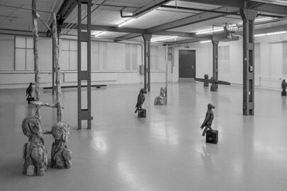 Die Widerhaken, von denen ich gesprochen haben, sind nicht nur im Material begründet, sondern oft auch in der Gestaltung selbst. Schauen wir uns noch zwei Arbeiten an. Das Halbfigurenpaar mit der gemeinsamen Leiter. Sie steckt in beider Schultern. lch habe nicht den Eindruck, dass sie ihre Körper verloren haben, sie stecken für mich in der Erde, in der Materie. Wolten die beiden die Leiter erklimmen, bleibt ihnen nichts anderes übrig, als sie gemeinsam in ihre Körper hinunterzuziehen, und damit selbst zur Leiter zu werden. So einfach ist das nicht und eigentlich sind wir jetzt schon wieder dort, wo wir eben beim Nachdenken über den Ferrozement waren. Das eine ist im andern enthalten. Und dasselbe gilt auch für die grösste Figur hier im Raum – sie war diesen Sommer in einer grossen Freilichtausstellung in Bex im Kanton Waadt installiert; sie umarmte dort nicht eine Säule, sondern einen Baum. Was dort der Naturkontext an lnhalt einbrachte, übernimmt hier die Architektur; das Gewachsene und das Gebaute; hier wie dort zeigt sich, dass eine Reise nur möglich ist, wenn wir das Gewachsene und das Gebaute mitnehmen. Es bedarf wohl keiner Erklärung, warum das Eisen den beiden so schwer auf den Schultern lastet; wir wissen ja alle, dass wir unser Leben selbst auf Traumreisen mitnehmen.