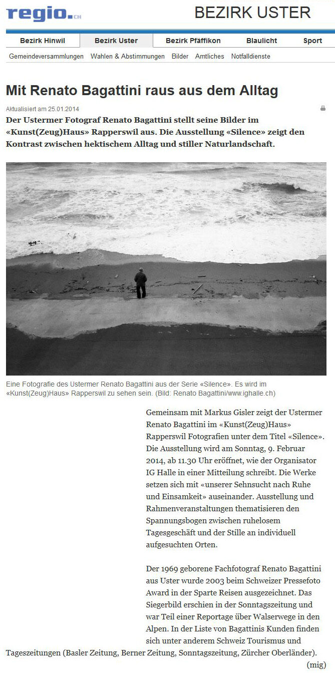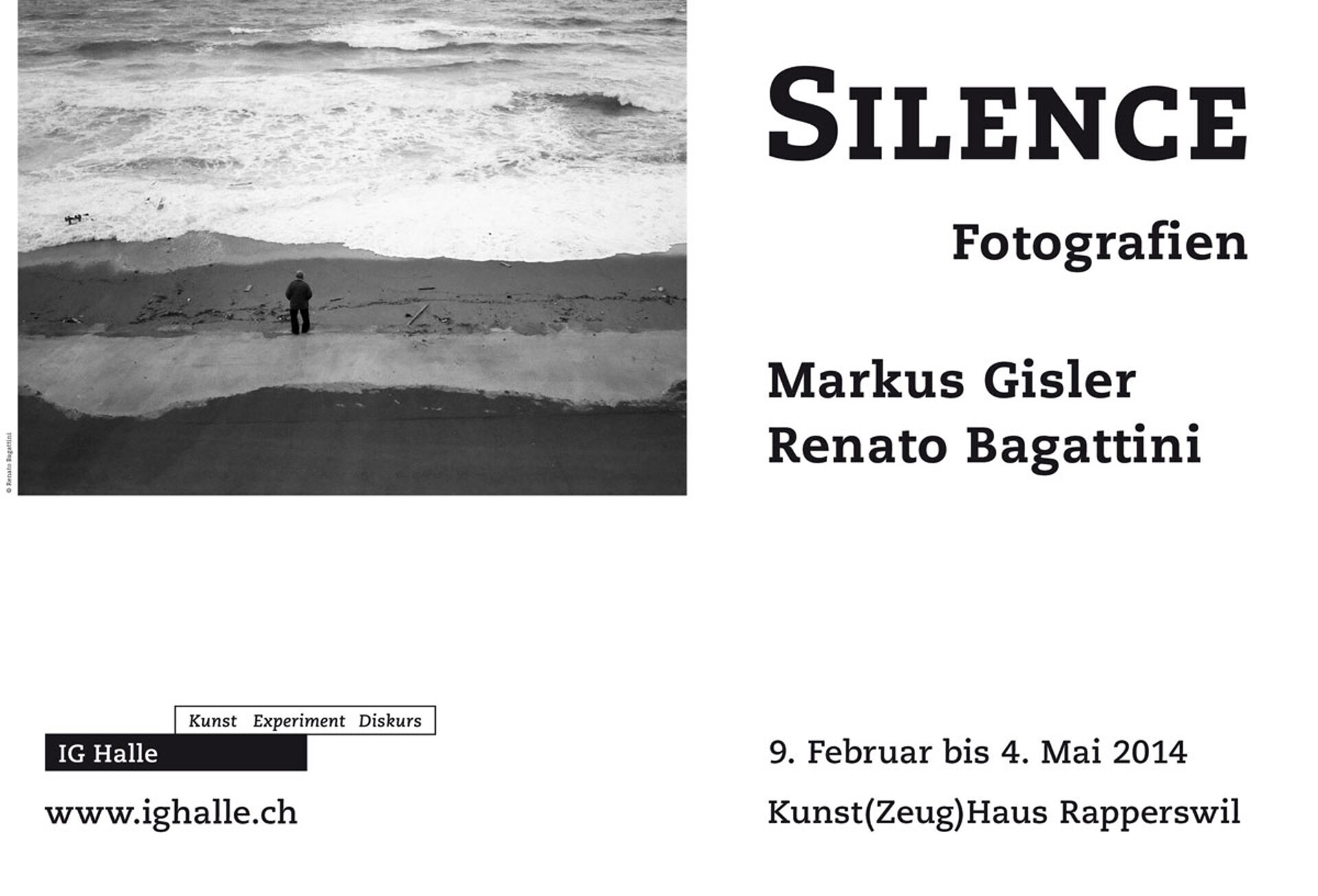 Das französische und englische Wort SILENCE steht als Ausstellungstitel der Fotografen Markus Gisler und Renato Bagattini. Beide von IG Halle-Kurator Peter Röllin vorgestellten Fotografen arbeiten eng im System des Berufsalltags, und beide finden als gute Bildschaffende in der einsamen und verlassenen Natur die für sie wichtigen Kontrastlandschaften. Ausstellung und Rahmenveranstaltungen thematisieren diesen Spannungsbogen zwischen ruhelosem Tagesgeschäft und der Stille sowie Einsamkeit an individuell aufgesuchten Orten.
