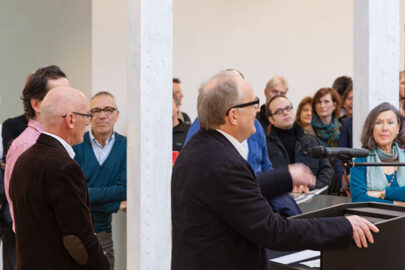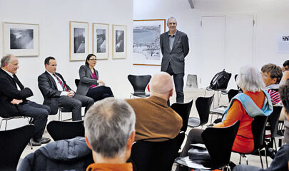 Gesprächsrunde zwischen den Fotografen Renato Bagattini, Markus Gisler sowie Bruno Glaus, Präsident Kunstverein Oberer Zürichsee und Peter Röllin, Leiter IG Halle