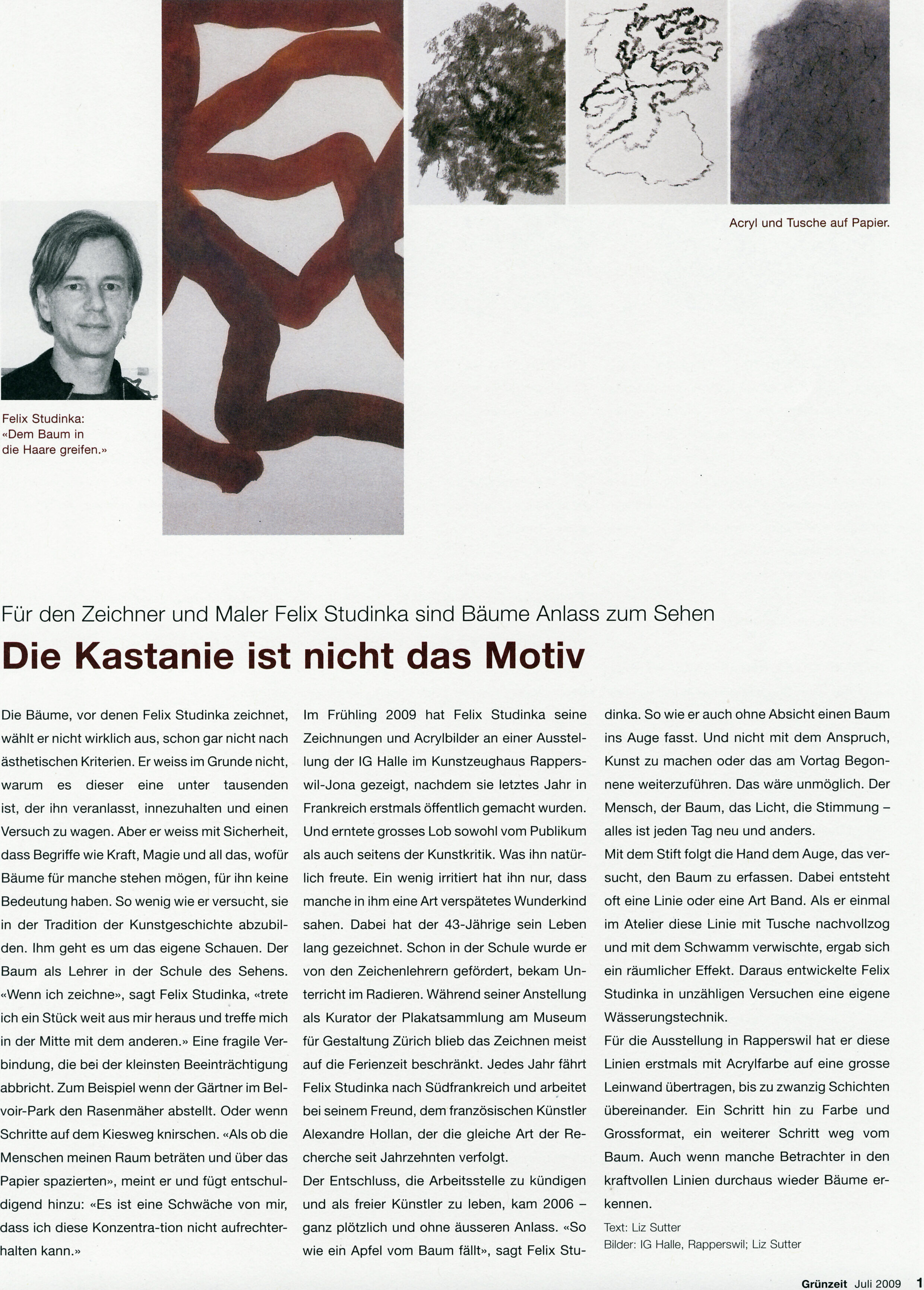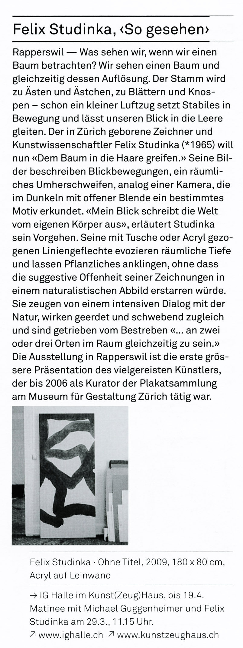 in Italien, in der Welt. Im eigenen Wohnquartier in Zürich, in der Parkanlage Beckenhof, betrachtet Felix Studinka eine hoch gewachsene Buche und notiert: „Die Krone explodiert und ein Funkenregen breitet sich aus. Ich versuche, sie anzusehen, ohne sie zu fixieren. Das Innere dehnt sich aus, die Funken werden dichter an den äusseren Rändern und bilden eine Korona.“ Ausgewählte Bäume werden über Jahre kontinuierlich aufgesucht, andere wechseln über Wege, Reisen und Blickpunkte, halten in der Wahrnehmung des Künstlers an als Masse, Bewegung, Verdoppelung, Spiegelung und gar als berührbare, oft nur fliegende Räumlichkeit. Diese Flüchtigkeit, dieses Auftauchen und Verschwinden, die steten Richtungswechsel, Gitter und Knäuelungen hat der Künstler mit Kohle, Tusche, Bleistift und Acryl in organischen Strukturen auf Papier gebracht. Die Annäherungen suchen nach dem Greifbaren und erreichen in dieser künstlerischen Arbeit ganz eigene und faszinierende Auswege: „Dem Baum in die Haare greifen. Er hat keinen Stamm und keine Umrisse.“ Felix Studinka gelingt eine Tiefenschärfe, die das Verlangen, sich im Freien mit dem grossen Gegenüber auseinanderzusetzen, nicht nur für ihn selbst zum Glücksgefühl steigert, sondern ebenso auch für uns Betrachter. Auch die Worte seiner Notizen schaffen wie seine Kalligrafien von Bäumen Fortsetzung in haarscharfer und zugleich instabiler Transparenz: „Ich folge den Richtungen in der Kastanie. In den besten Momenten habe ich den sehr klaren Eindruck, an zwei oder drei Orten im Raum gleichzeitig zu sein. Lautlose Explosionen im Kopf.“
