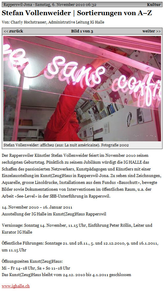 Der Rapperswiler Künstler Stefan Vollenweider feiert im November 2010 seinen sechzigsten Geburtstag. Pünktlich zu seinem Jubiläum würdigt die IG Halle das Schaffen des passionierten Netzwerkers, Künstlers und Kunstpädagogen mit einer Einzelausstellung im Kunst(Zeug)Haus. Zu sehen sind Zeichnungen, grosse Aquarelle und Linoldrucke, Installationen aus dem Fundus Bauschutt, bewegte Bilder sowie Dokumentationen von Interventionen im öffentlichen Raum, u.a. der Arbeit See-Level in der SBB-Unterführung in Rapperswil.
