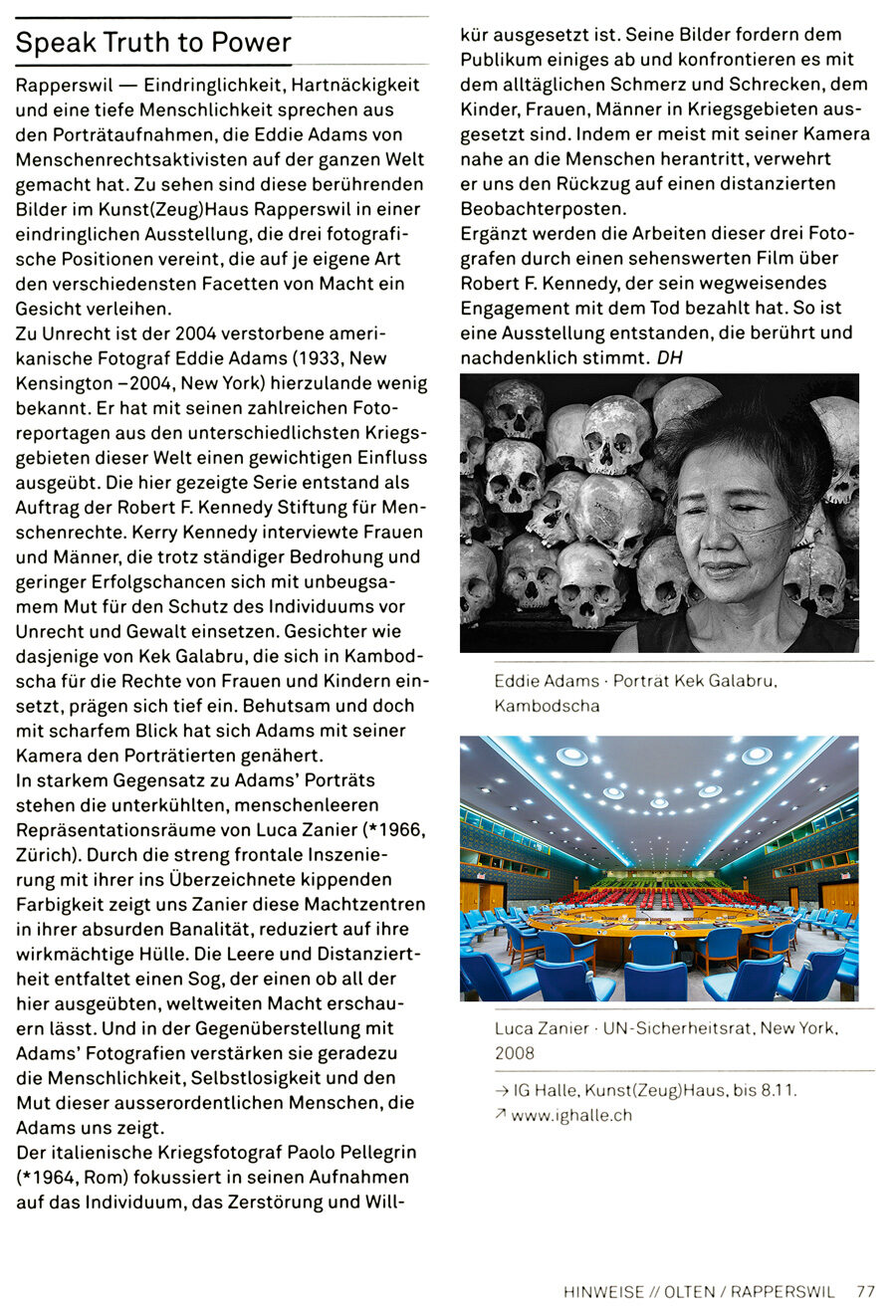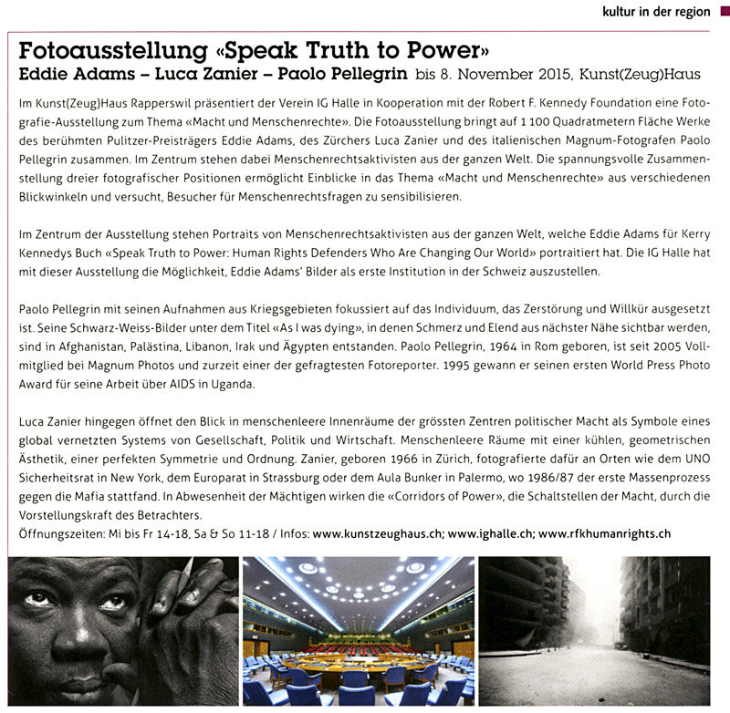 Ab 30. August präsentiert die IG Halle im Kunst(Zeug)Haus Rapperswil eine Fotografie-Ausstellung zum Thema Macht und Menschenrechte und bringt auf 1200 m2 Fläche Werke des berühmten amerikanischen Fotografen Eddie Adams, des Zürchers Luca Zanier und des italienischen Kriegsfotografen Paolo Pellegrin zusammen. Die Ausstellung SPEAK TRUTH TO POWER ist eine Kooperation mit der Robert F. Kennedy Human Rights Foundation Switzerland und der Auftakt zu deren gesamtschweizerischem Programm zur Menschenrechtsbildung.