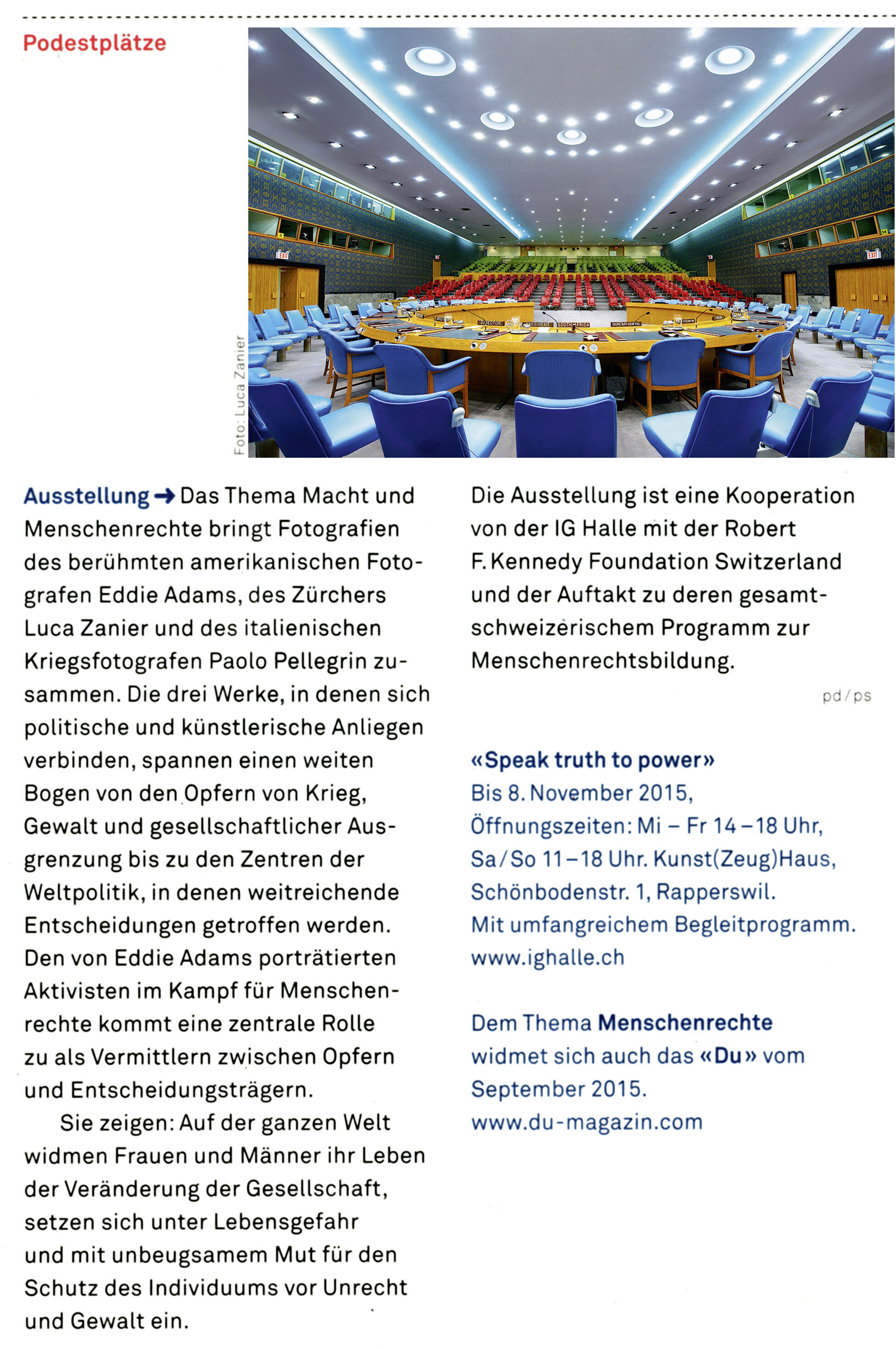 Zur Ausstellung erschien ein Du Magazin über die Robert F. Kennedy Stiftung für Menschenrechte. Unter anderem mit Beiträgen über die Ausstellung Speak Truth To Power.