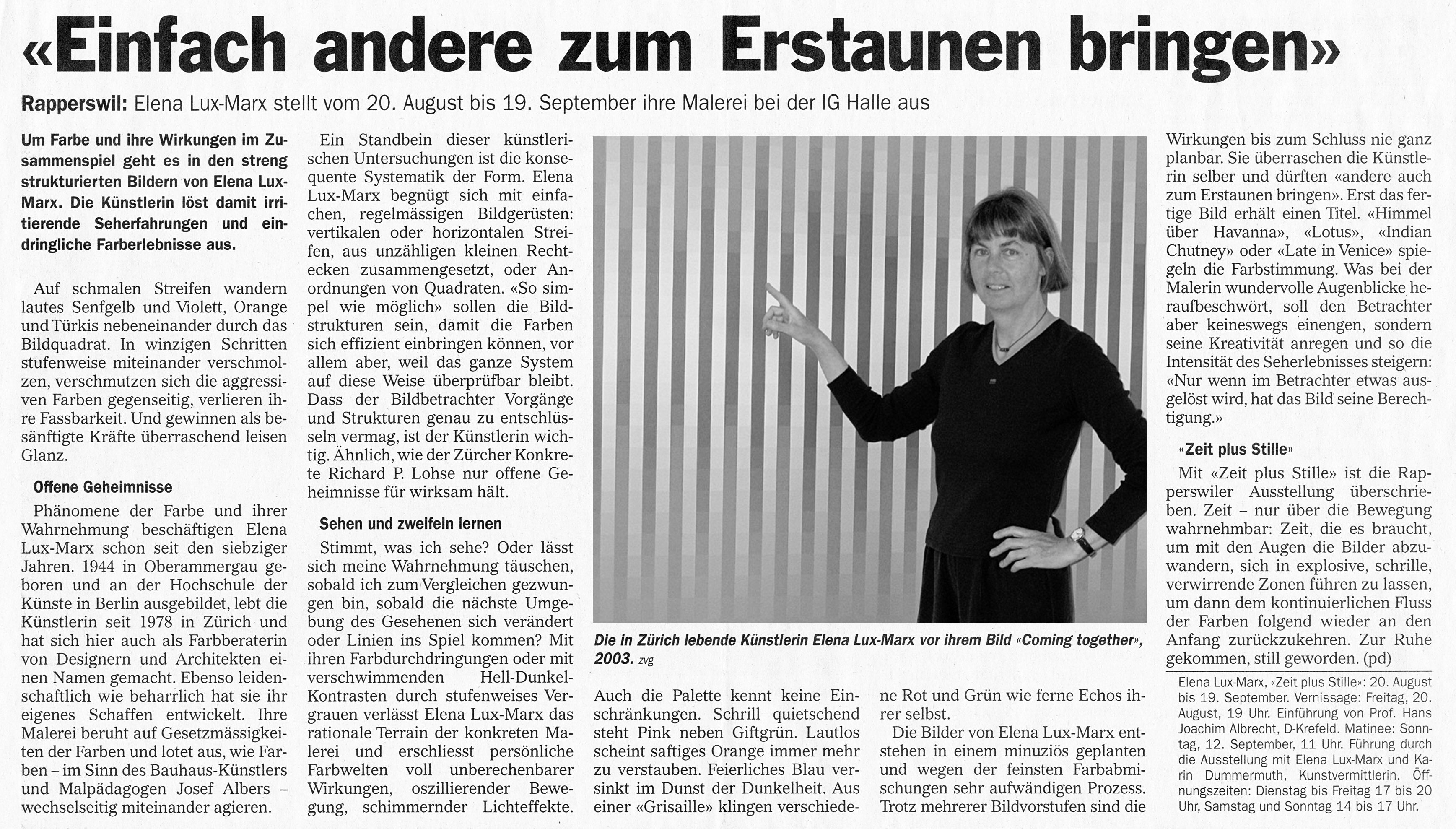 Phänomene der Farbe und ihrer Wahrnehmung beschäftigen Elena Lux-Marx schon seit den Siebziger Jahren. 1944 in Oberammergau geboren und an der Hochschule der Künste in Berlin ausgebildet, lebt die Künstlerin seit 1978 in Zürich und hat sich hier auch als Farbberaterin von Designern und Architekten einen Namen gemacht. Ebenso leidenschaftlich wie beharrlich hat sie ihr eigenes Schaffen entwickelt. Ihre Malerei beruht auf Gesetzmässigkeiten der Farben und lotet aus, wie Farben – im Sinn des Bauhaus-Künstlers und Malpädagogen Josef Albers – wechselseitig miteinander agieren.