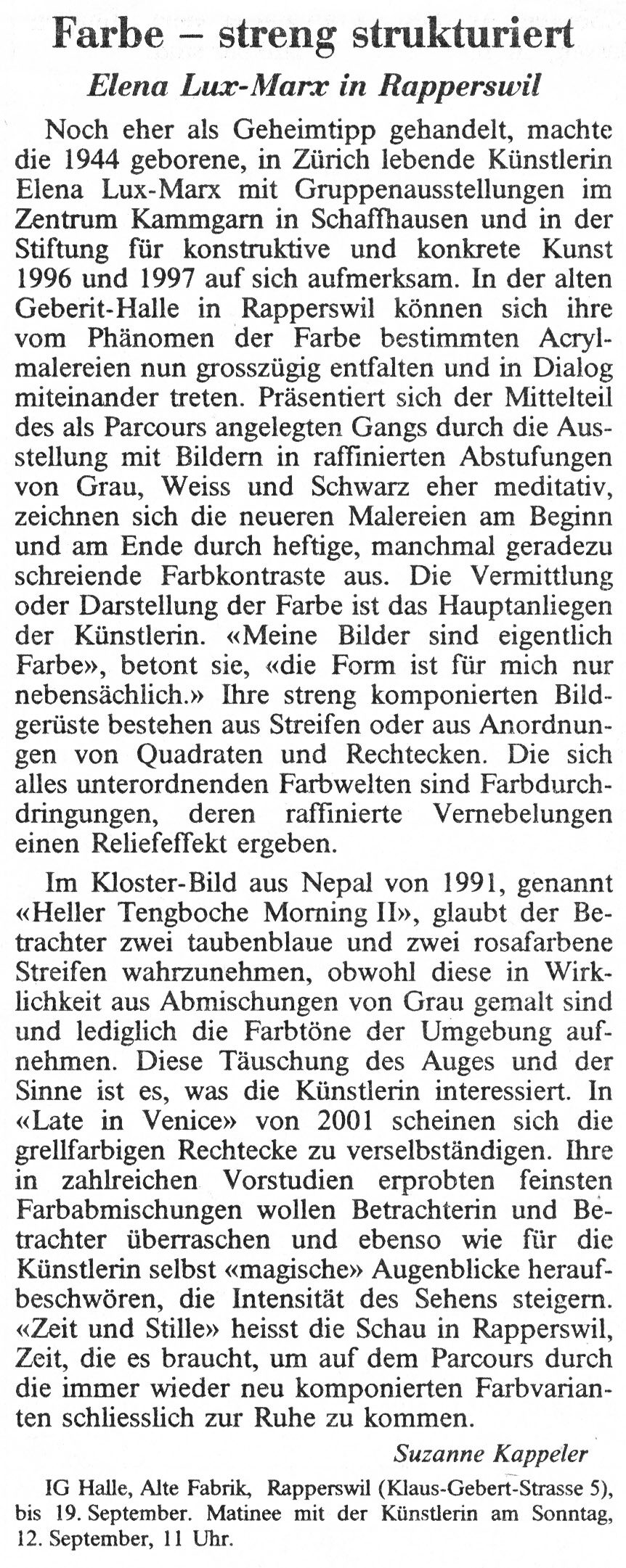 Stimmt, was ich sehe? Oder lässt sich meine Wahrnehmung täuschen, sobald ich zum Vergleichen gezwungen bin, sobald die nächste Umgebung des Gesehenen sich verändert oder Linien ins Spiel kommen? Mit ihren Farbdurchdringungen oder mit verschwimmenden Hell-Dunkel-Kontrasten durch stufenweises Vergrauen verlässt Elena Lux-Marx das rationale Terrain der konkreten Malerei und erschliesst persönliche Farbwelten voll unberechenbarer Wirkungen, oszillierender Bewegung, schimmernder Lichteffekte. Auch die Palette kennt keine Einschränkungen. Schrill quietschend steht Pink neben Giftgrün. Lautlos scheint saftiges Orange immer mehr zu verstauben. Feierliches Blau versinkt im Dunst der Dunkelheit. Aus einer „Grisaille“ klingen verschiedene Rot und Grün wie ferne Echos ihrer selbst.