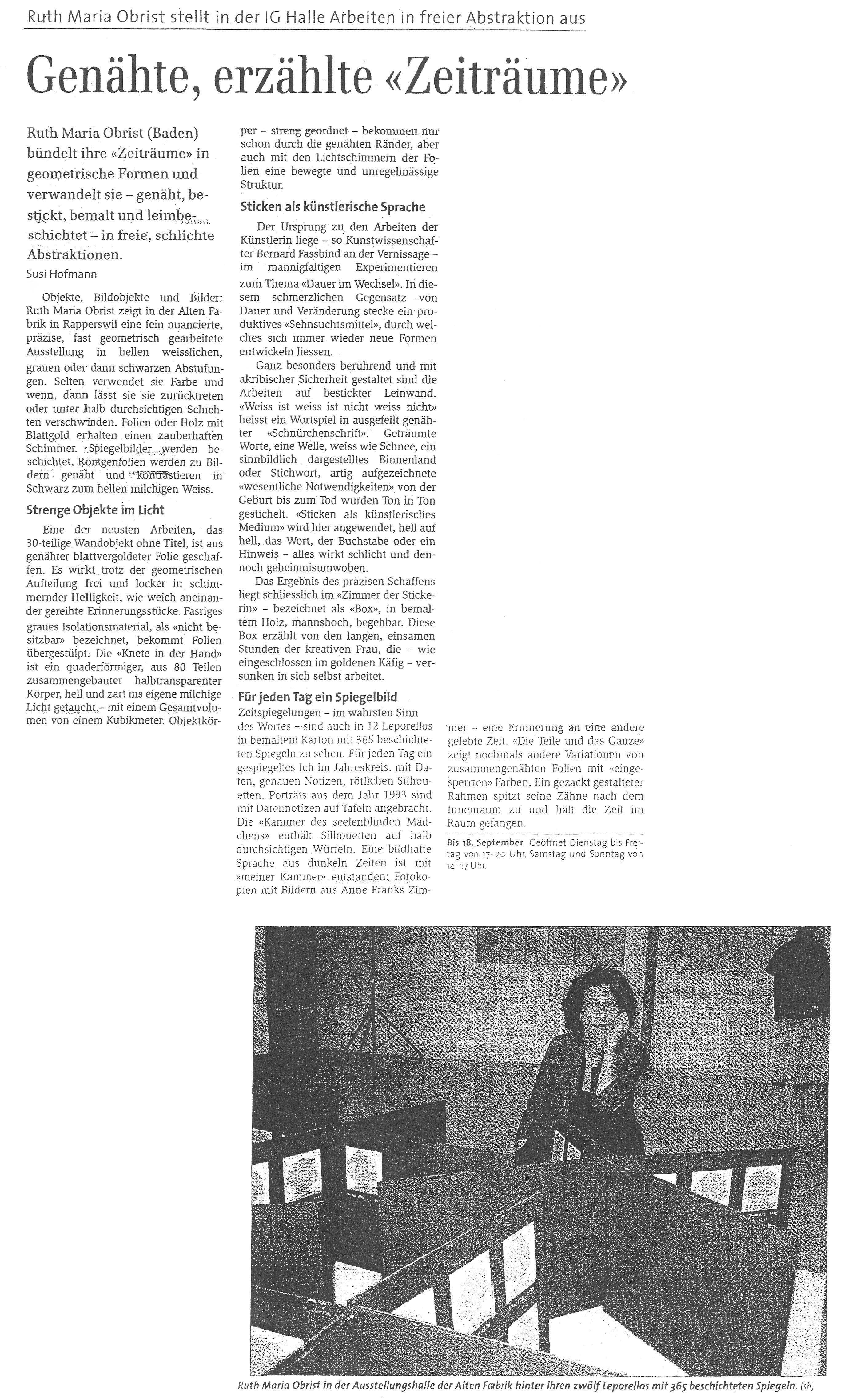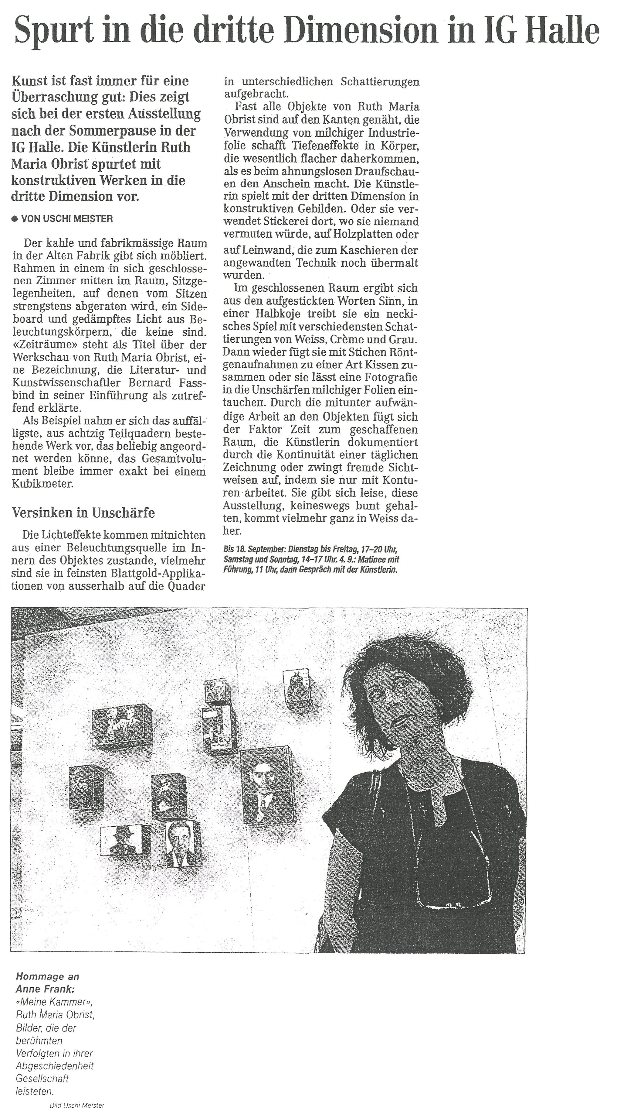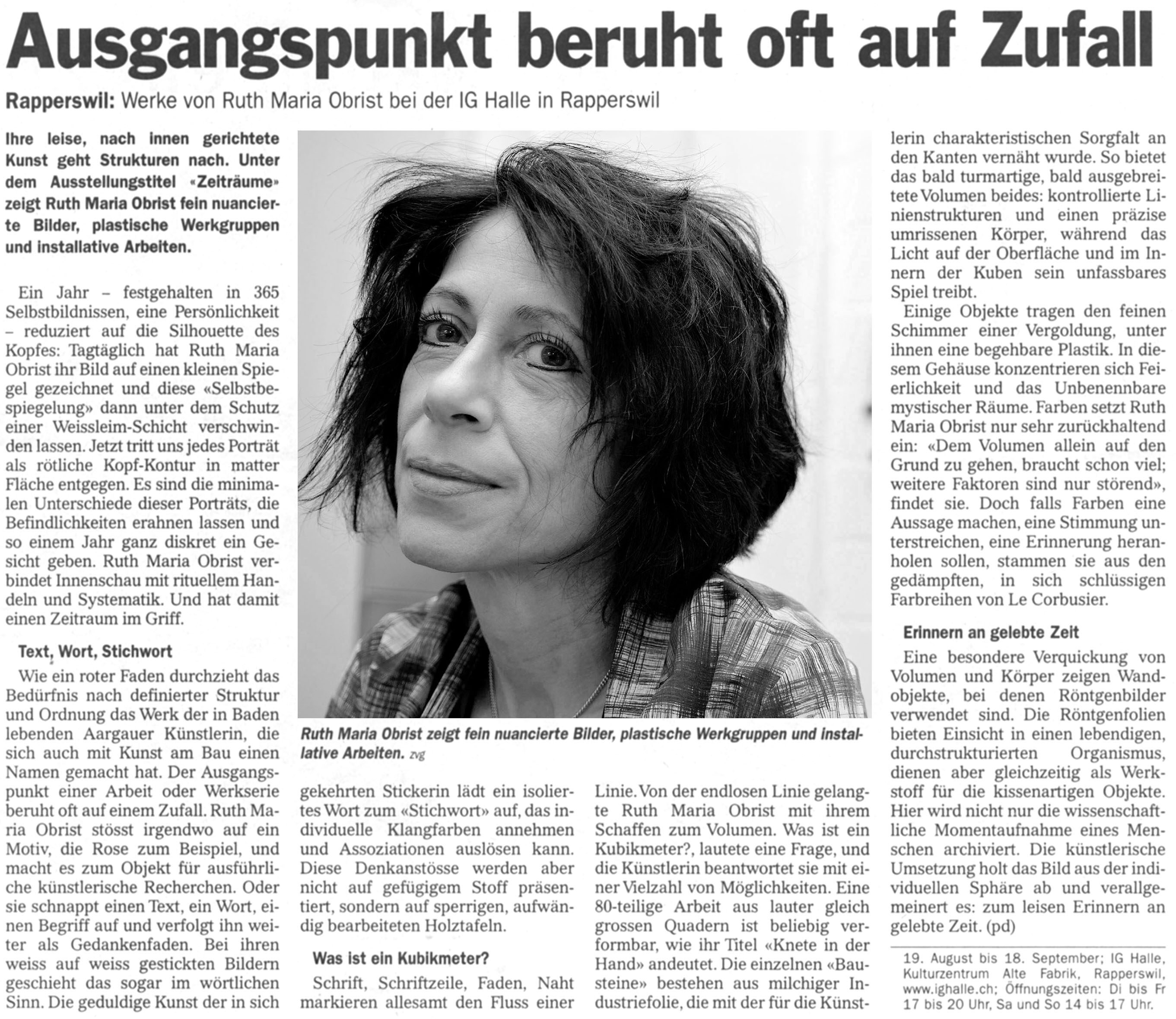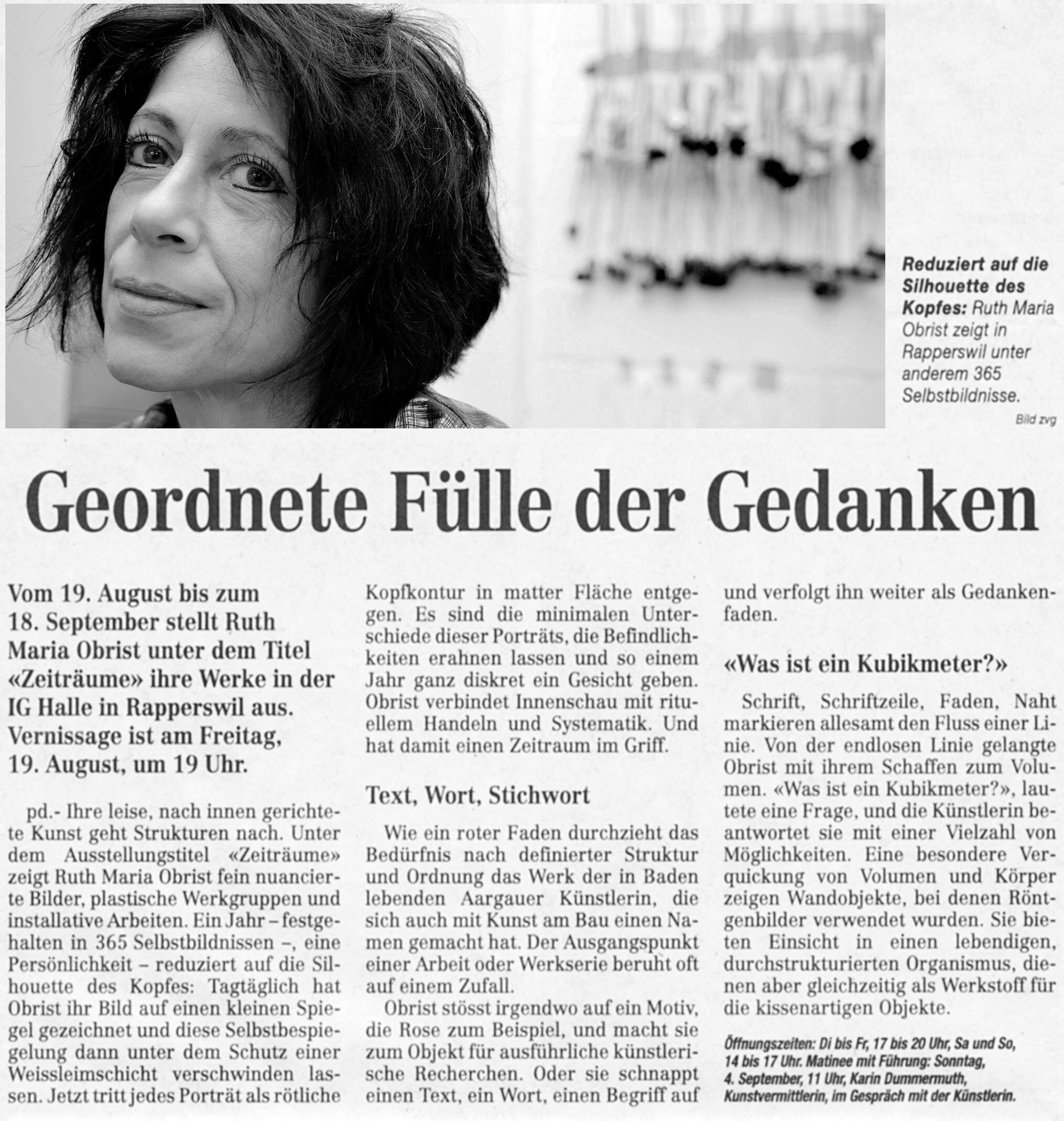Wie ein roter Faden durchzieht das Bedürfnis nach definierter Struktur und Ordnung das Werk der in Baden lebenden Aargauer Künstlerin, die sich auch mit Kunst am Bau einen Namen gemacht hat. Der Ausgangspunkt einer Arbeit oder Werkserie beruht oft auf einem Zu-Fall. Ruth Maria Obrist stösst irgendwo auf ein Motiv, die Rose zum Beispiel, und macht sie zum Objekt für ausführliche künstlerische Recherchen. Oder sie schnappt einen Text, ein Wort, einen Begriff auf und verfolgt ihn weiter als Gedanken-Faden. Bei ihren weiss auf weiss gestickten Bildern geschieht das sogar im wörtlichen Sinn. Die geduldige Kunst der in sich gekehrten Stickerin lädt ein isoliertes Wort zum „Stichwort“ auf, das individuelle Klangfarben annehmen und Assoziationen auslösen kann. Diese Denkanstösse werden aber nicht auf gefügigem Stoff präsentiert, sondern auf sperrigen, aufwändig bearbeiteten Holztafeln.