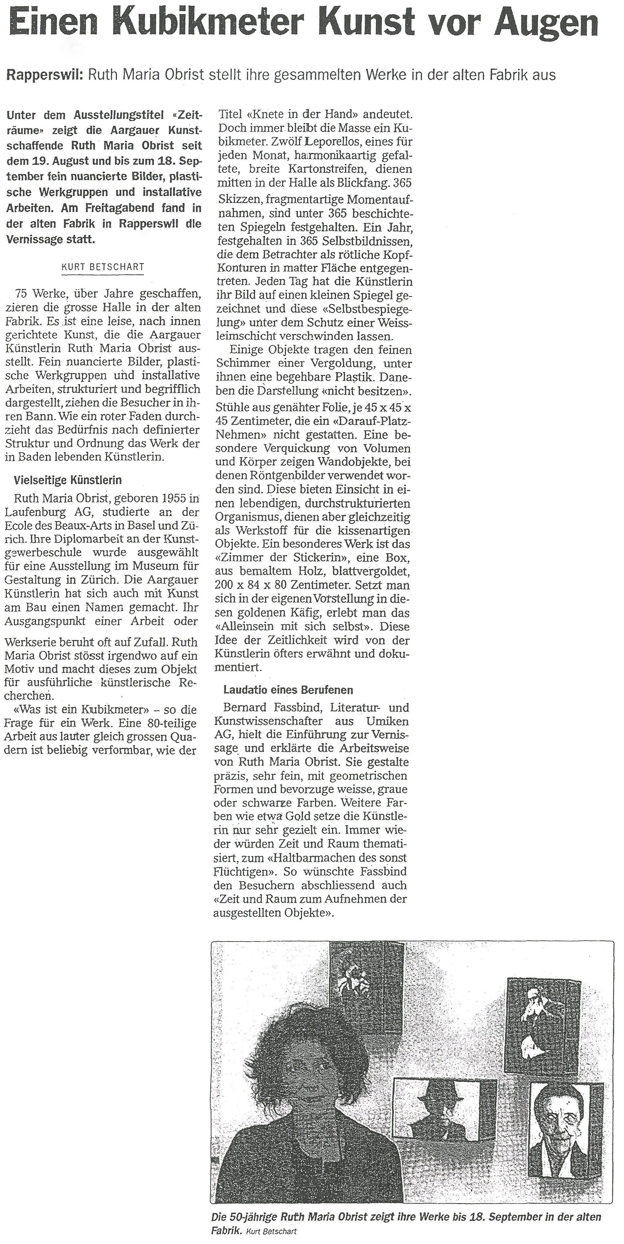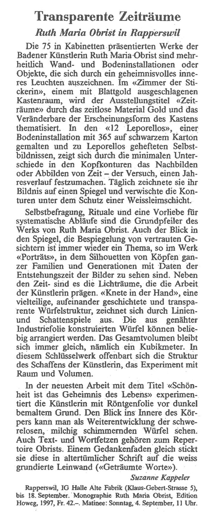 Schrift, Schriftzeile, Faden, Naht markieren allesamt den Fluss einer Linie. Von der endlosen Linie gelangte Ruth Maria Obrist mit ihrem Schaffen zum Volumen. Was ist ein Kubikmeter? lautete eine Frage, und die Künstlerin beantwortet sie mit einer Vielzahl von Möglichkeiten. Eine 80-teilige Arbeit aus lauter gleich grossen Quadern ist beliebig verformbar, wie ihr Titel „Knete in der Hand“ andeutet. Die einzelnen „Bausteine“ bestehen aus milchiger Industriefolie, die mit der für die Künstlerin charakteristischen Sorgfalt an den Kanten vernäht wurde. So bietet das bald turmartige, bald ausgebreitete Volumen beides: kontrollierte Linienstrukturen und einen präzise umrissenen Körper, während das Licht auf der Oberfläche und im Innern der Kuben sein unfassbares Spiel treibt.