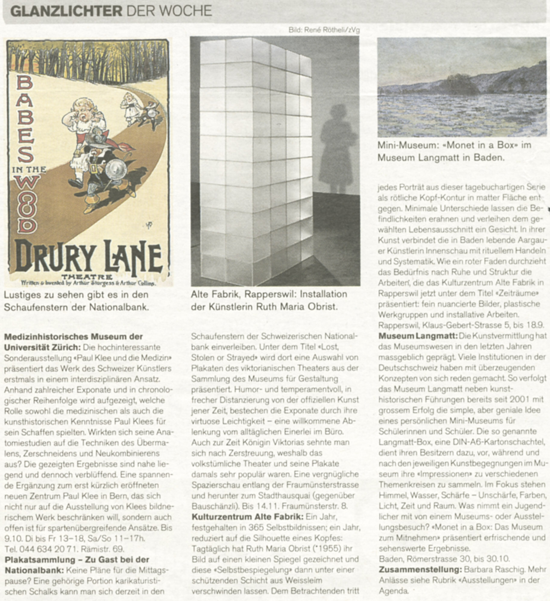 Ein Jahr – festgehalten in 365 Selbstbildnissen, eine Persönlichkeit – reduziert auf die Silhouette des Kopfes: Tagtäglich hat Ruth Maria Obrist ihr Bild auf einen kleinen Spiegel gezeichnet und diese „Selbstbespiegelung“ dann unter dem Schutz einer Weissleim-Schicht verschwinden lassen. Jetzt tritt uns jedes Porträt als rötliche Kopf-Kontur in matter Fläche entgegen. Es sind die minimalen Unterschiede dieser Porträts, die Befindlichkeiten erahnen lassen und so einem Jahr ganz diskret ein Gesicht geben. Ruth Maria Obrist verbindet Innenschau mit rituellem Handeln und Systematik. Und hat damit einen Zeitraum im Griff.